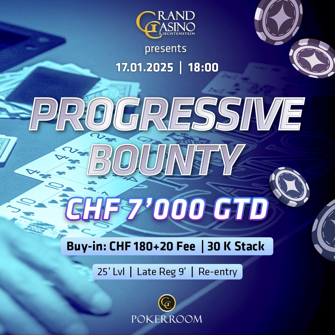 Um 18:00 Uhr geht es an den Turniertischen im GC Pokerroom Bendern mit dem Progressive Bounty weiter. Das Buy-In für das MTT mit den steigenden Kopfgeldern beträgt 180+20 CHF. Mit 30.000 Starting Chips geht es in 25-minütige Level. In den ersten 9 davon sind während der Late Registration unlimited Re-Entrys möglich. Die Preisgeldgarantie liegt bei 7.000 Schweizer Franken.