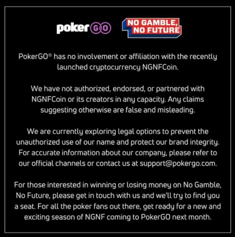 Der führende Poker-Streaming-Anbieter PokerGO sah sich heute dazu genötigt, zum No-Gamble-No-Future (NGNF) Coin ein Statement herauszugeben. Der Coin hatte, zumindest dem Namen nach, eine Verbindung zu No Gamble No Future, dem neuesten Cash Game TV-Format von PokerGO, assoziiert. Hierbei handelt es sich jedoch nicht um einen Poker-Coin, sondern lediglich um eine Crpytowährung, die den Namen und das Motto des Pokerformats treffend gefunden hat.