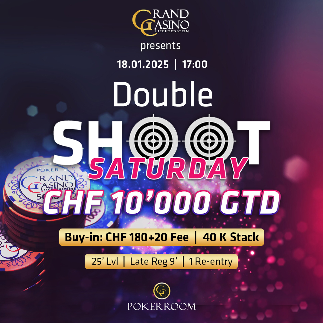 Heute wird im Grand Casino Liechtenstein das CHF 180+20 Double Shoot Saturday gespielt – CHF 10.000 werden garantiert. 25 Minuten Level werden laufen, Registration ist offen bis in Level 9.