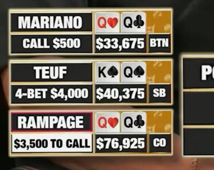 Was zuerst wohl viele Zuschauer*innen erschrecken lässt, stellt sich relativ schnell als Zuordnungsfehler heraus, da Mariano und Rampage beide exakt die gleiche Hand halten, und Mariano seine „Damen“ auch preflop entsorgt. Das spricht beides dafür, dass es sich hier um einen technischen Fehler handelt – so erklären wir uns das zumindest.