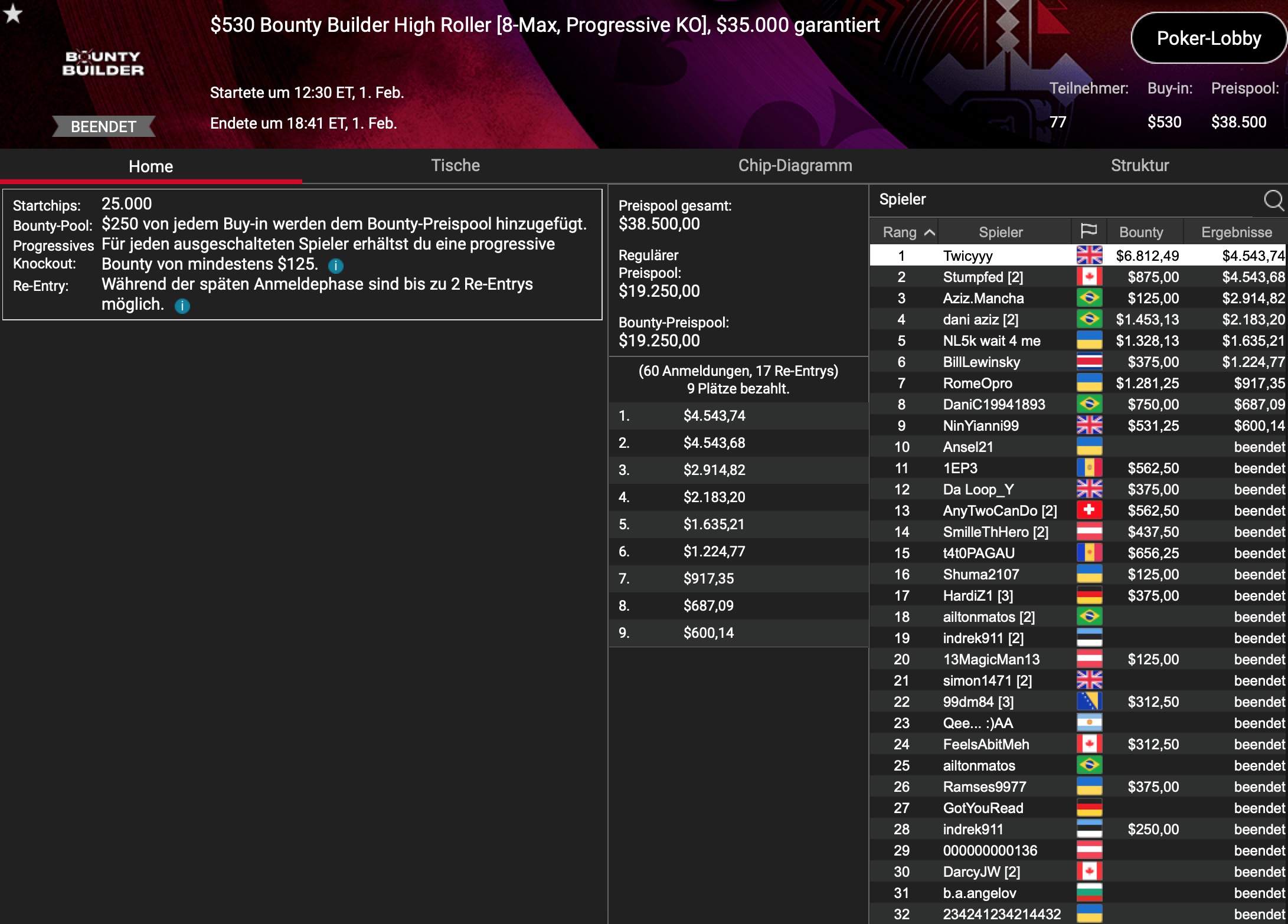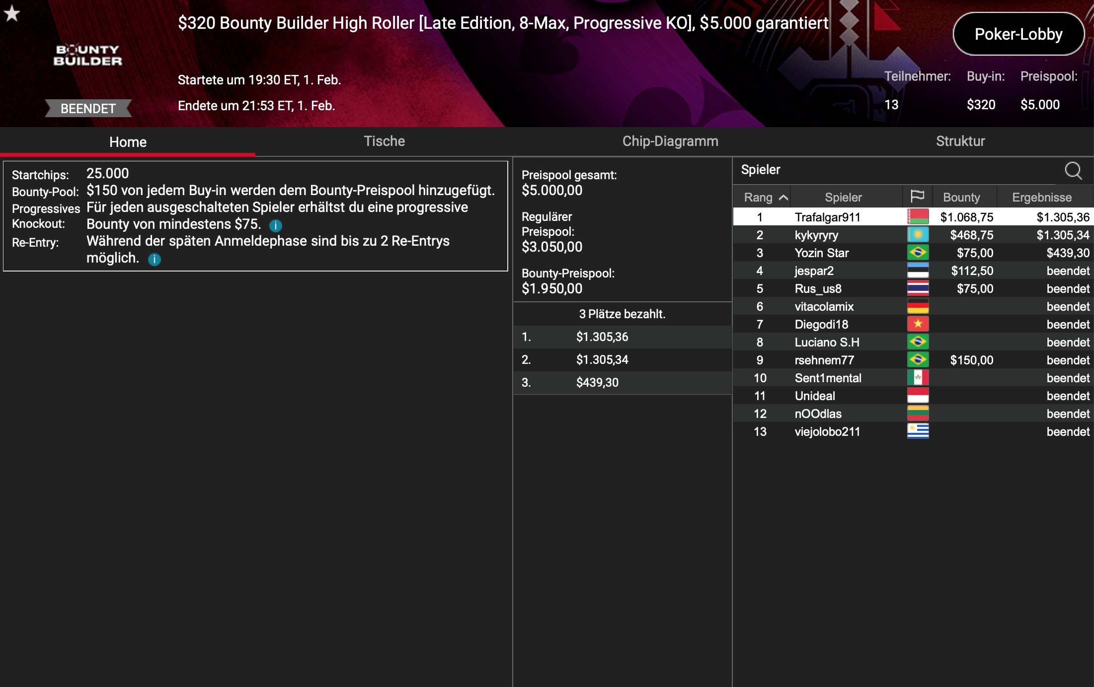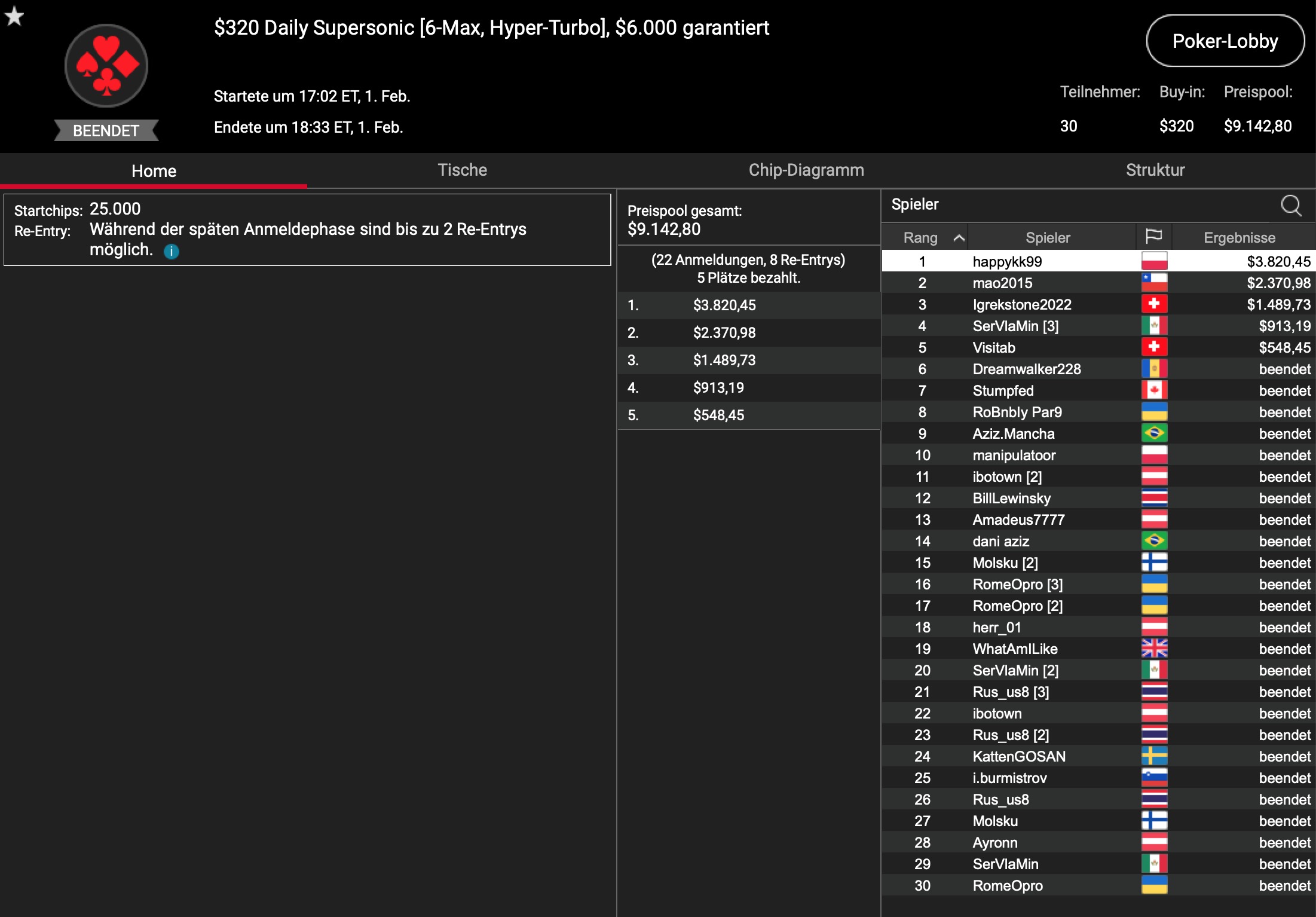 Der Turniersieg ging nach 91 Minuten an „happykk99“ aus Polen, zusammen mit $3.820 Siegprämie. Runner-Up wurde „mao2015“ aus Chile, der seine Bankroll um $2.370 vergrößerte.