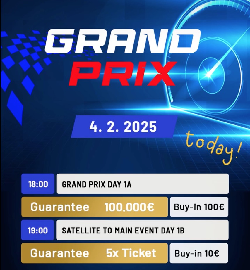 Das Super Satellite zum Main Event Tag 1A startete am Montag um 18:00 Uhr mit den Spieler*innen, die um 20 Grand Prix Main Event Tickets à €100 für den heutigen Starttag 1A (18:00 Uhr) spielen sollten. In das Wettrennen um die Tickets gingen sie mit 20.000 Starting Chips in die 20-minütigen Blindrunden. Die Late Reg war 10 Level geöffnet.