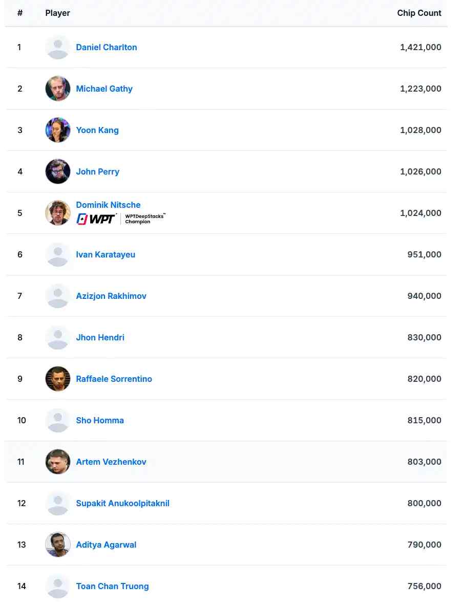 Daniel Charlton hat den größten Chipstack derzeit mit 1.421.000 Chips. In Position 5 sitzt derzeit Dominik Nitsche mit 1.024.000 Chips.