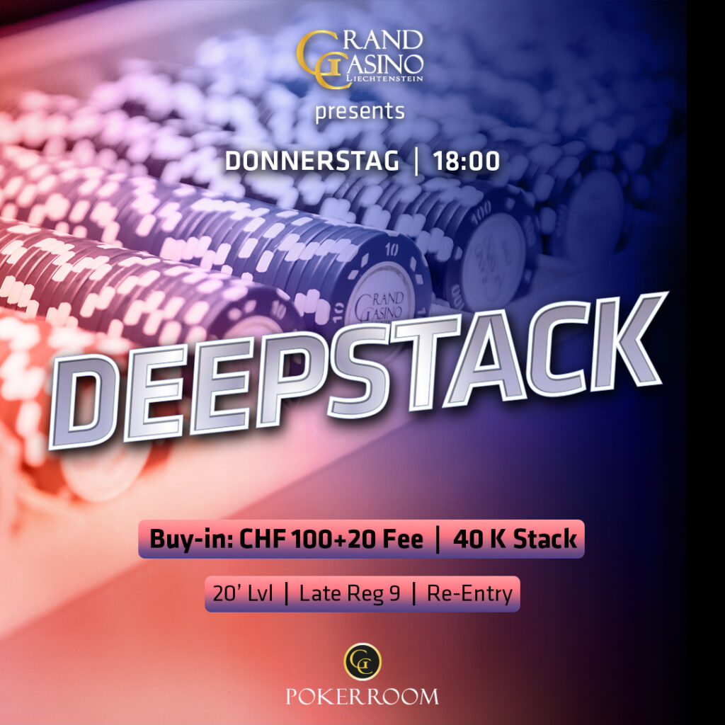 Heute geht es im Grand Casino Liechtenstein weiter mit dem CHF 100+20 Deepstack. Gespielt wird mit 40.000 Start Stack und 20-Minuten Blind Levels.