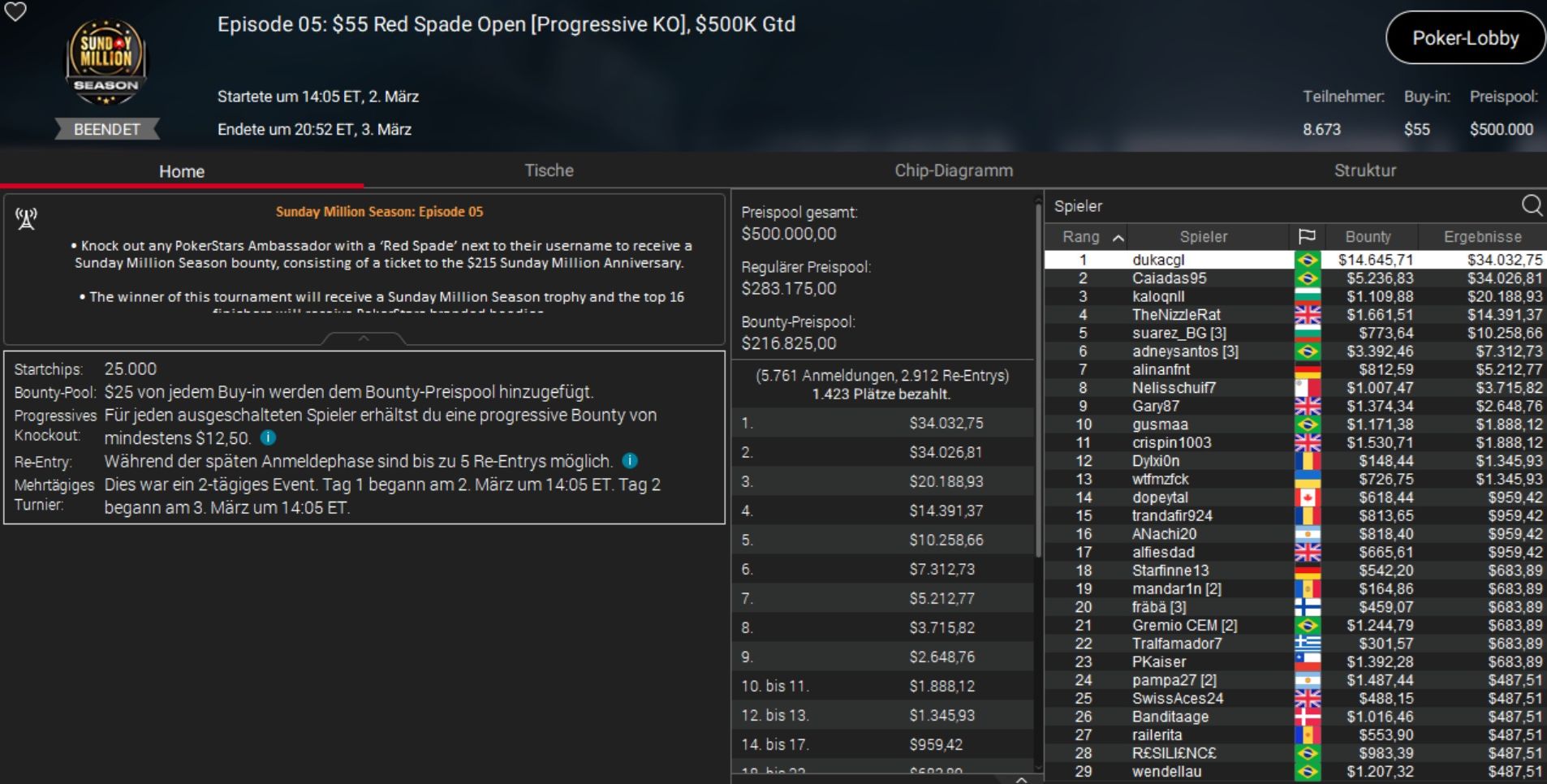 „Tchelo Shelby“ holte sich unter 9.954 Entrys die Sunday Million und strich über $85.000 ein. Bei m Red Spade Open gab es sogar einen brasilianischen Doppelsieg durch „dukacgl“ und „Caiadas95“ $48.000 bzw. $39.000 einbrachte.