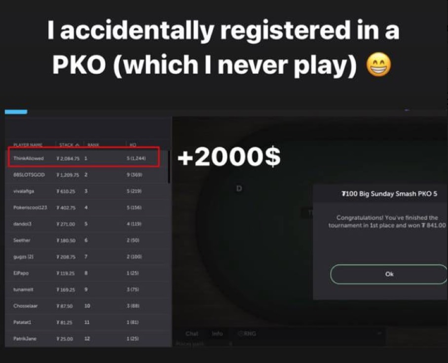 Für den vielleicht kuriosesten Erfolg des Sonntags sorgte Diana „ThinkAllowed“ Kalietina. Die ukrainische Grinderin spielt grundsätzlich keine Knockout-Tournments und gab auf ihren Social Media Kanälen zu, sich aus Versehen für das $100 Big Sunday Smash PKO angemeldet zu haben. Das sollte sich allerdings für sie auszahlen – genau genommen mit $2.085 Payout, aus Sieg- und Knockoutprämien.