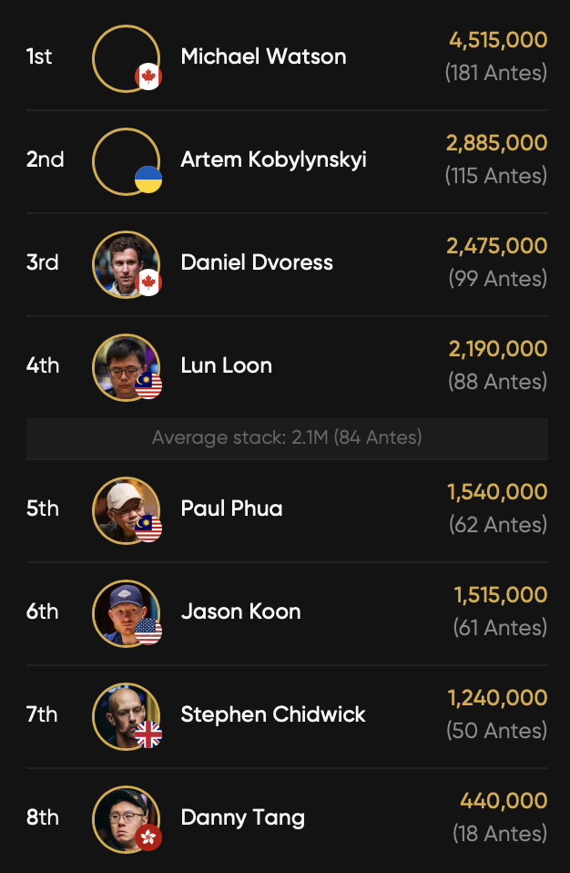 Neun Spieler sind ITM und der erste, der im Geld ausschied, war Winfred Yung für $49.000. Nun haben alle Spieler $64.000 sicher. Leider haben wir keine DACH-Spieler mehr im Rennen, dafür aber bekannte Namen wie Jason Koon, Paul Phua, Stephen Chidwick und Daniel Dvoress.