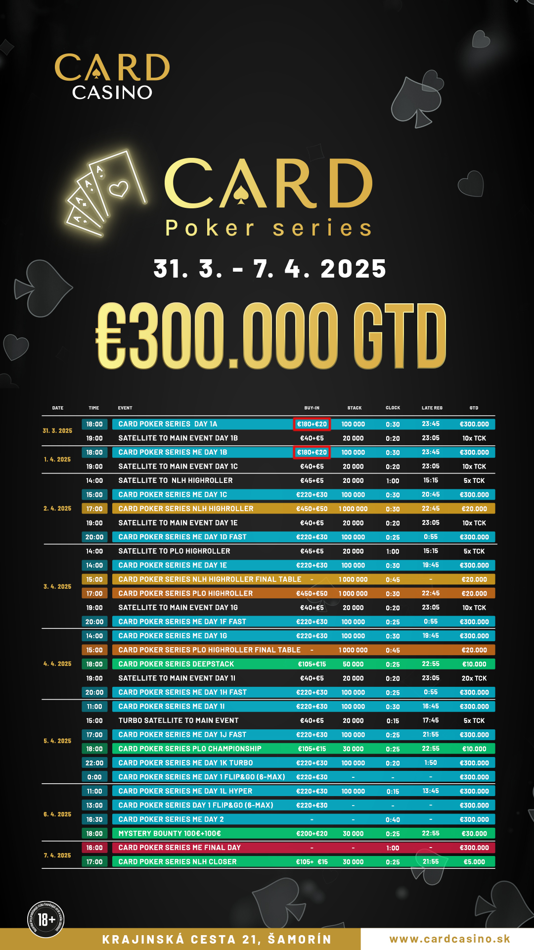 Die nächste Ausgabe der Card Poker Series findet vom 30. März bis 7. April im Card Casino Samorin (vormals Card Casino Bratislava) statt. Dabei wird es im Main Event um mindestens garantierte €300.000 Preisgeld gehen, in den Side Events mindestens um €95.000 und mit zahlreichen Satellites mit garantierten Tickets knackt die Card Poker Series deutlich die €400k Garantiegrenze.