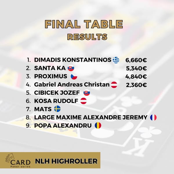 Bereits entschieden ist das €450+50 NLH Highroller. Den Sieg holte der Grieche Konstantinos Dimadis, der sich über ein Preisgeld von €6.660 freuen konnte.