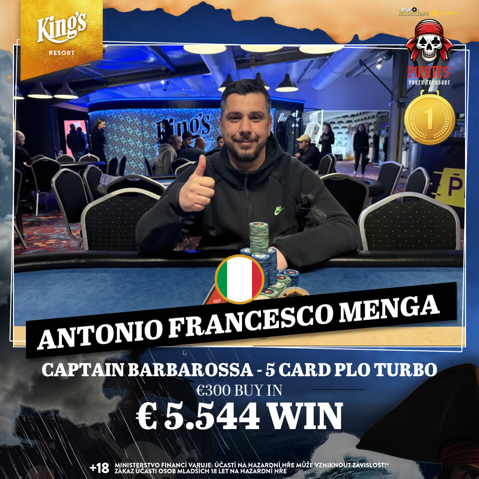 56 5-Karten-Spieler erschienen für dieses Event an den Tischen und bezahlten zusätzlich für 24 Re-Entries. Dies ergab einen Preispool von €20.160, der auf die Top 11 Spieler verteilt wurde. Der Italiener Antonio Franceso Menga stellte seine Piratenfähigkeiten unter Beweis, konnte sich als Sieger feiern lassen und über €5.544 freuen.