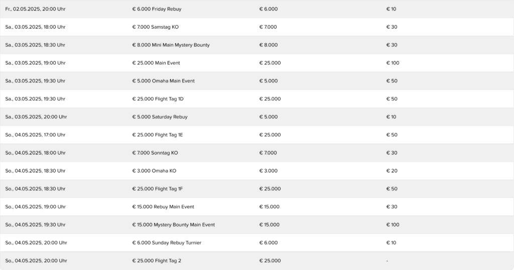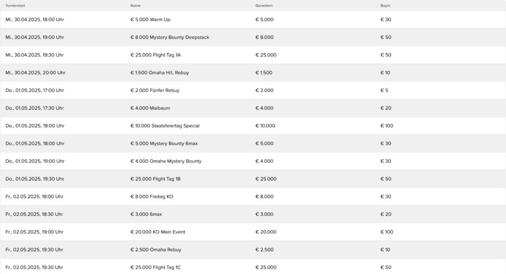 Das beliebte Flight Turnier mit lediglich €50 Buy-In und €25.000 Garantie wird mit 6 Flights, also den Starttagen 1A bis 1F, gespielt. Mittwoch bis Freitag finden sie jeweils um 19:30 Uhr statt, am Sonntag wird es dann um 17:00 und 18:30 Uhr noch einmal etwas schneller getaktete Flights geben, in denen man sich die Teilnahme am zweiten und damit finalen Tag, SO ab 20:00 Uhr, erspielen kann.