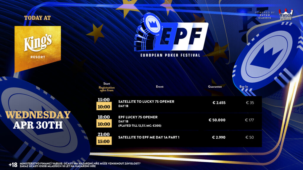 Nachdem Big Monday ist das European Poker Festival (EPF) powered by Dutch Classics & Pokerreis mit dem EPF Lucky 7s Opener jetzt auch mit dem ersten großen Turnier (€50.000 Garantie) im King’s Resort Rozvadov gestartet. In das 2-Day Auftaktevent mit 3 Starttagen (plus Flip and Go) starteten 70 Entrys, von denen sich die Top-8 über €300 Min-Cash und die Finalquali, die Top-2 sogar noch über einen €799 Chipleader Bonus freuen konnten.