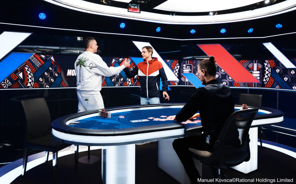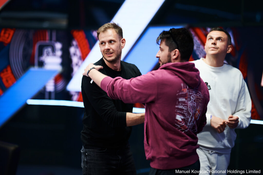 Nach dem Bustout von Enrico Coppola hielt Shevlkiakov über 20 Millionen Chips was mehr war als seine beiden letzten Kontrahenten zusammen besaßen. Nachdem der Russe Boris Angelov in einer großen Hand zum deutlich shortesten Stack gemacht hatte, konnte der Bulgare gegen den Russen noch einmal aufdoppeln. Allerdings zog der Fan Favorite Angelov im Battle of the Blinds gegen Khossein Kokhestani dann den kürzeren. Nach dem preflop Raise des Ukrainers und dem Call des Bulgaren war auf dem Flop 9c 7c 2d und dem Ts Turn für jeden etwas dabei. Während Kokhestani mit Tc 6s das Top Pair getroffen hatte, hielt Angelov mit Ac 8h den OESD mit dem Ass als Overcard. Auf den Push des Ukrainers ging der Bulgare lange in den Tank und musste eine Time Bank nach der andern setzen bis auch seine letzte in die Mitte wanderte, genau wie anschließend all seine Chips. Der River brachte mit der 3s keine Hilfe für den Zweiten des Vorjahres, der sich als Dritter in diesem Jahr zwar nicht verbesserte jedoch €439.200 mitnehmen konnte.