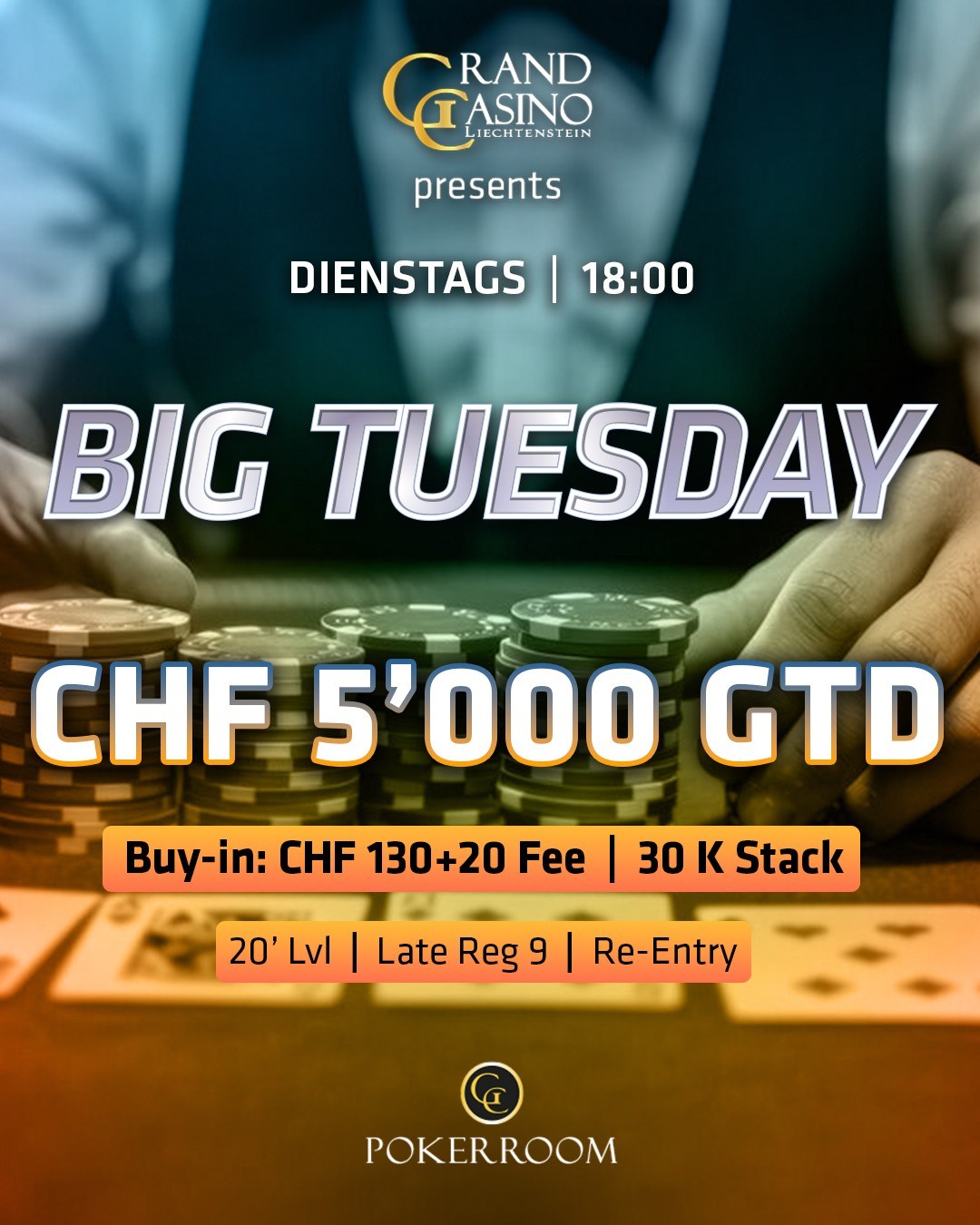 Heute wird im Grand Casino Liechtenstein das CHF 130+20 Big NLH Tuesday gespielt, mit CHF 5.000 gtd – ab 18:00 Uhr. 30.000 Chips gibt es für jedes Buy-Ins zum Start, unlimitiert Re-Entries sind möglich. 20 Minuten Level werden gespielt, Late-Reg ist bis in Level 9 möglich.