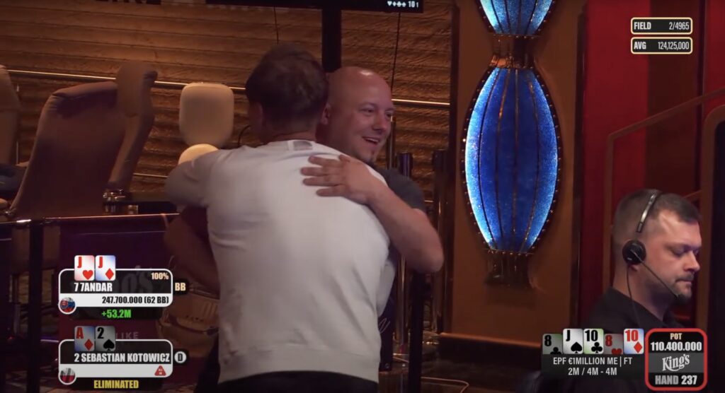 Auf Rang 3 musste dann der Italiener Christopher Campisano mit einem kombinierten Payout (€10.350 Tciket + €83.650) von €94.000 das EPF €1Million Main Event verlassen. Im Heads-Up landeten so Katoicz und Blasko. Der Pole ging mit einer 75:49-BB-Führung in das finale Duell. Interessanterweise war „7andar“ bis hierhin für kein einziges Bustout am Finaltisch zuständig. Das sollte ihm aber im entscheidenden Moment gelingen, nachdem er die HU-Führung übernommen hatte. In der finalen Hand des Tages pushte Sebastian Kotowicz seine letzten 13 BBs mit A2o in die Pocket Jacks von Marke Blasko. Das Board brachte keine Hilfe für den Polen und ihm am Ende €101.050 an Gewinn.