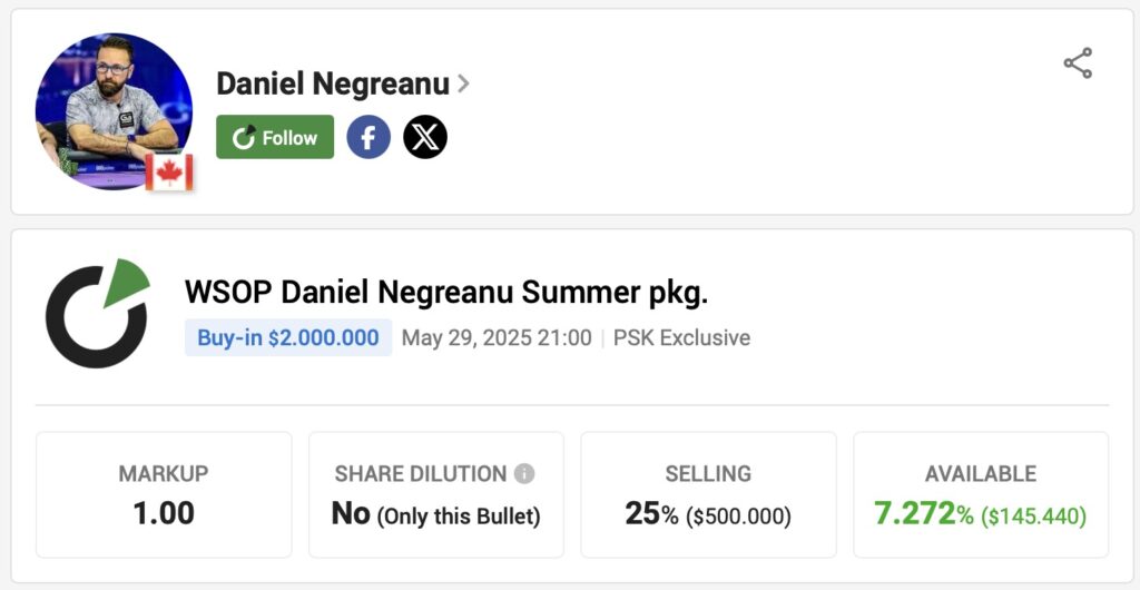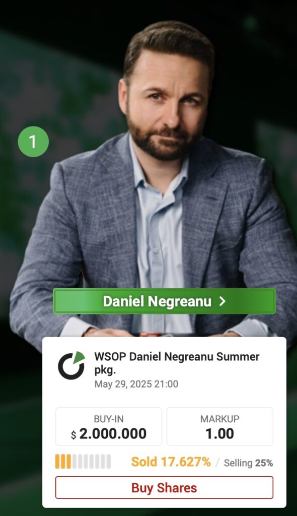 Vor 2 Tagen postete der Kanadier, dass er auf PokerStake 25 % seiner Buy-Ins anbieten wird und zwar zum Selbstkostenpreis ohne Markup. Daniel „KidPoker“ Negreanu hat geplant, $2 Millionen an Startgeldern bei der diesjährigen WSOP zu investieren. Ein Viertel davon sind also $500.000, die sich Pokerinvestoren und/oder Fans des Pokerausnahmespielers sichern können.