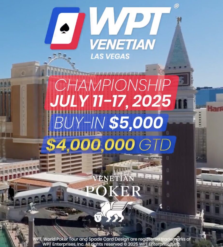 Das WPT Venetian Las Vegas Championship wird vom 11. bis 17. Juli im Venetian Poker Room im gleichnamigen Resort stattfinden. In dem Komplex mit nachgebauter Rialtobrücke und dem weithin sichtbaren Campanile wird es um mindestens garantierte 4 Millionen Dollar im WPT Championship Event gehen. Das Stargeld wird $5.000 betragen. Es sind 3 Startflights vorgesehen, die vom 11. bis 13. Juli jeweils am 11:10 Uhr starten. Insgesamt umfasst das WPT Event 5 Spieltage, von denen am letzten, dem 17. Juli, der Final Table live gestreamt wird.