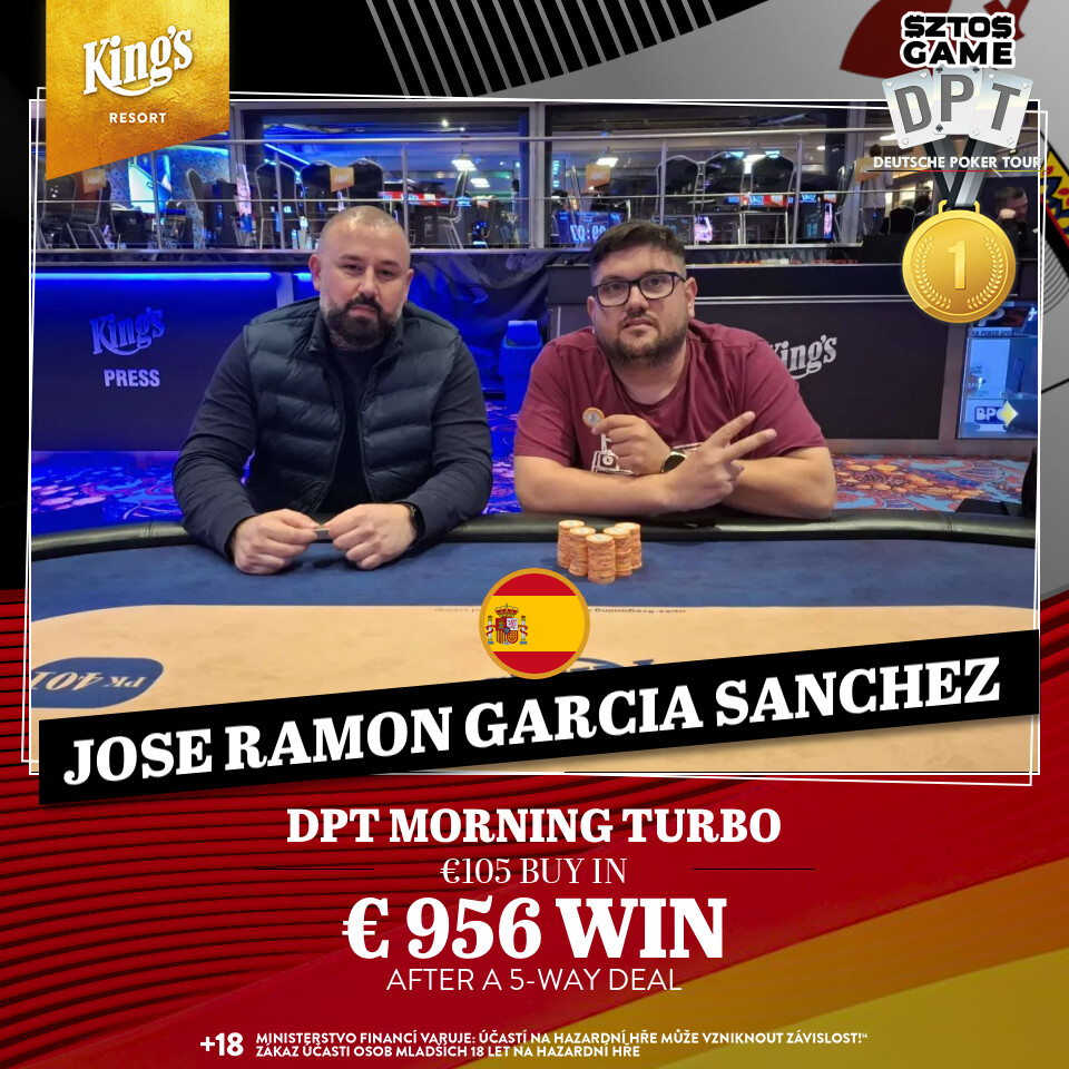 Nach dem erhielt Samuel Mühlhaus (GE) als 5. am Ende €726, Tarik Demir (GER) wurde auf Platz 4 mit €858 belohnt, der Spieler mit den Initialen „TD“ (GER) erhielt als Dritter €869 und Runner-Up „czarek“ (GER) €950. Das Top-Payout von €956 ging zusammen mit den Bragging Rights für den DPT Morning Turbo Sieg nach Spanien an Jose Garcia Sanchez.