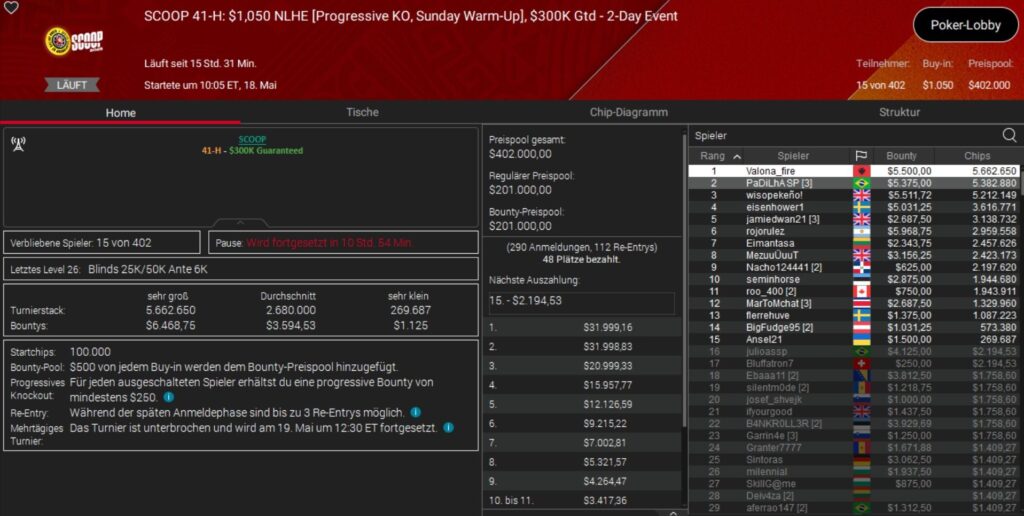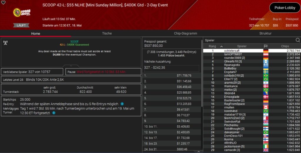 Und auch bei der $530 Sunday Million (SCOOP Event 42-M) liegt mit „Olorionek“ ein Spieler mit österreichischer Flagge auf dem vorläufigen Spitzenplatz.
