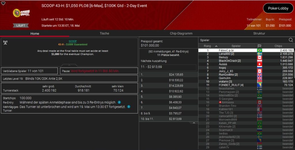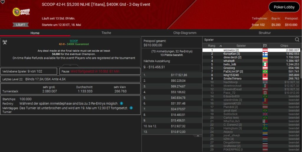 So führt Ole „wizowizo“ Schemion die Titans mit einem Startgeld von $5.200 beim SCOOP Event 42-H in das neunköpfige Finale, in dem auch Leonard „Grozzorg“ Maue und Daniel „SmilleThHero“ Smiljkovic vertreten sind.