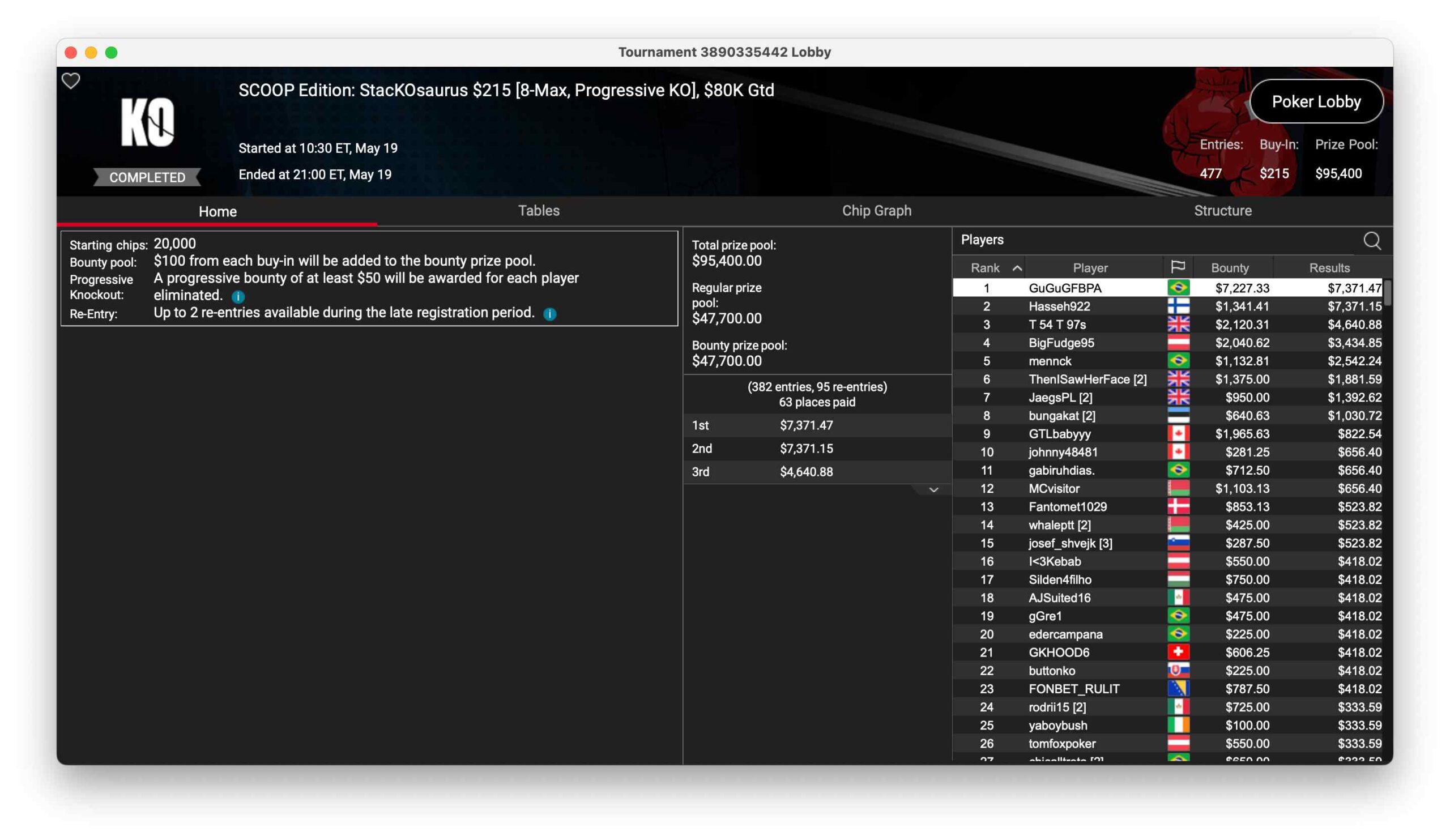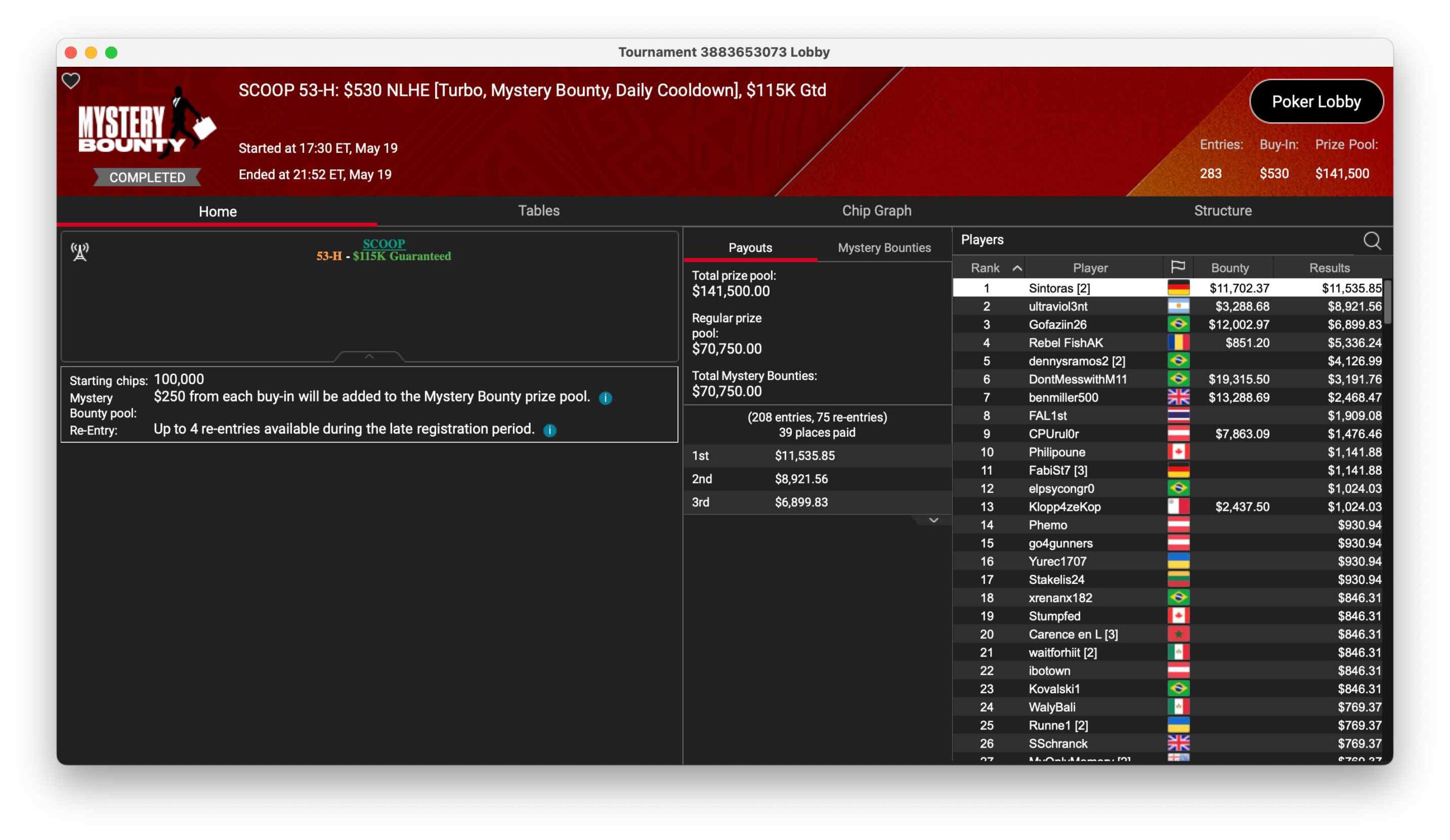 Der deutsche Dauerbrenner „Sintoras“ holte das $530 NLHE Turbo Mystery Bounty Daily Cooldown mit 283 Entries und $141.500 Preispool. $11.702 + $11.535 ist die Belohnung für den Erstplatzierten.