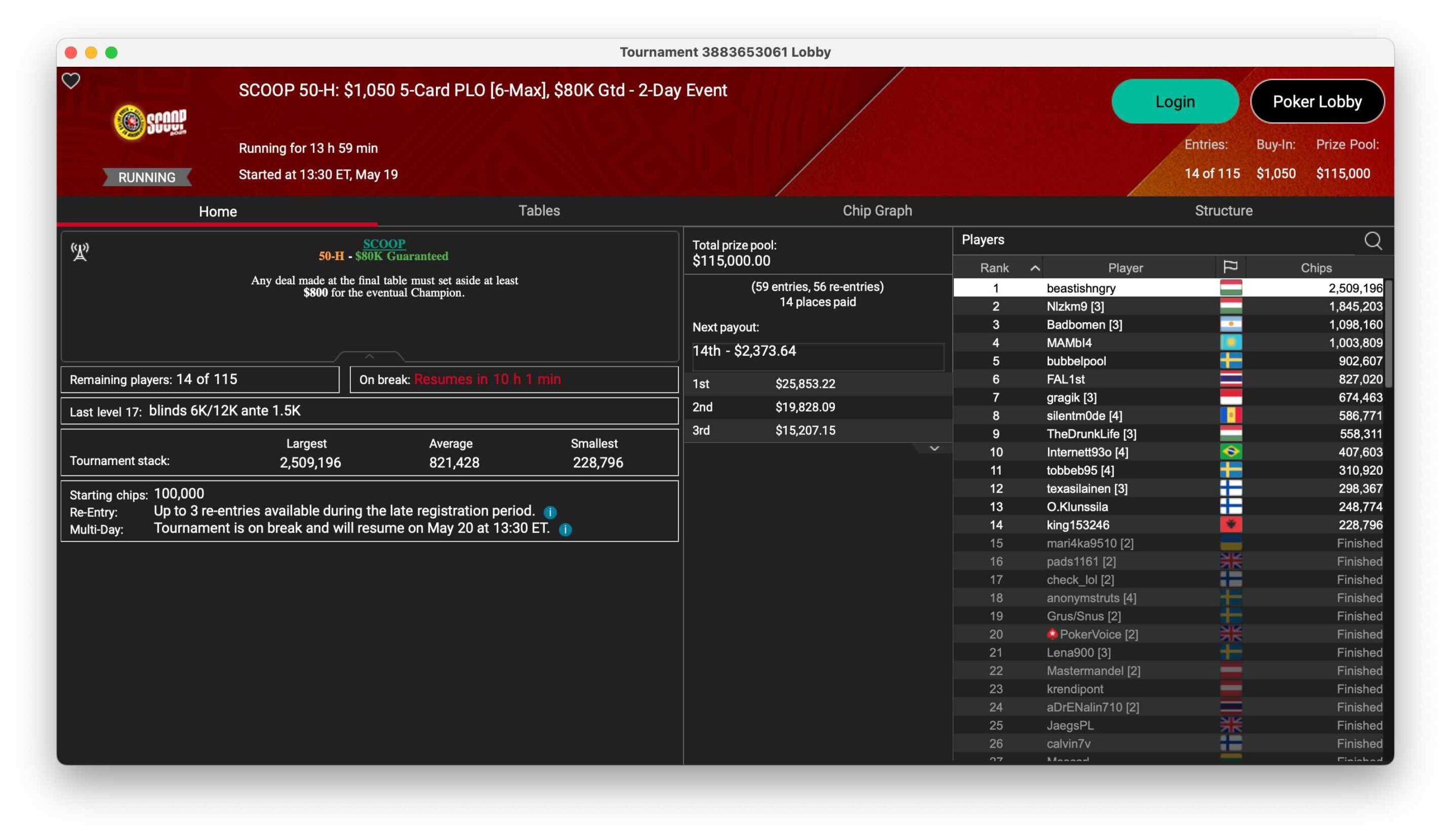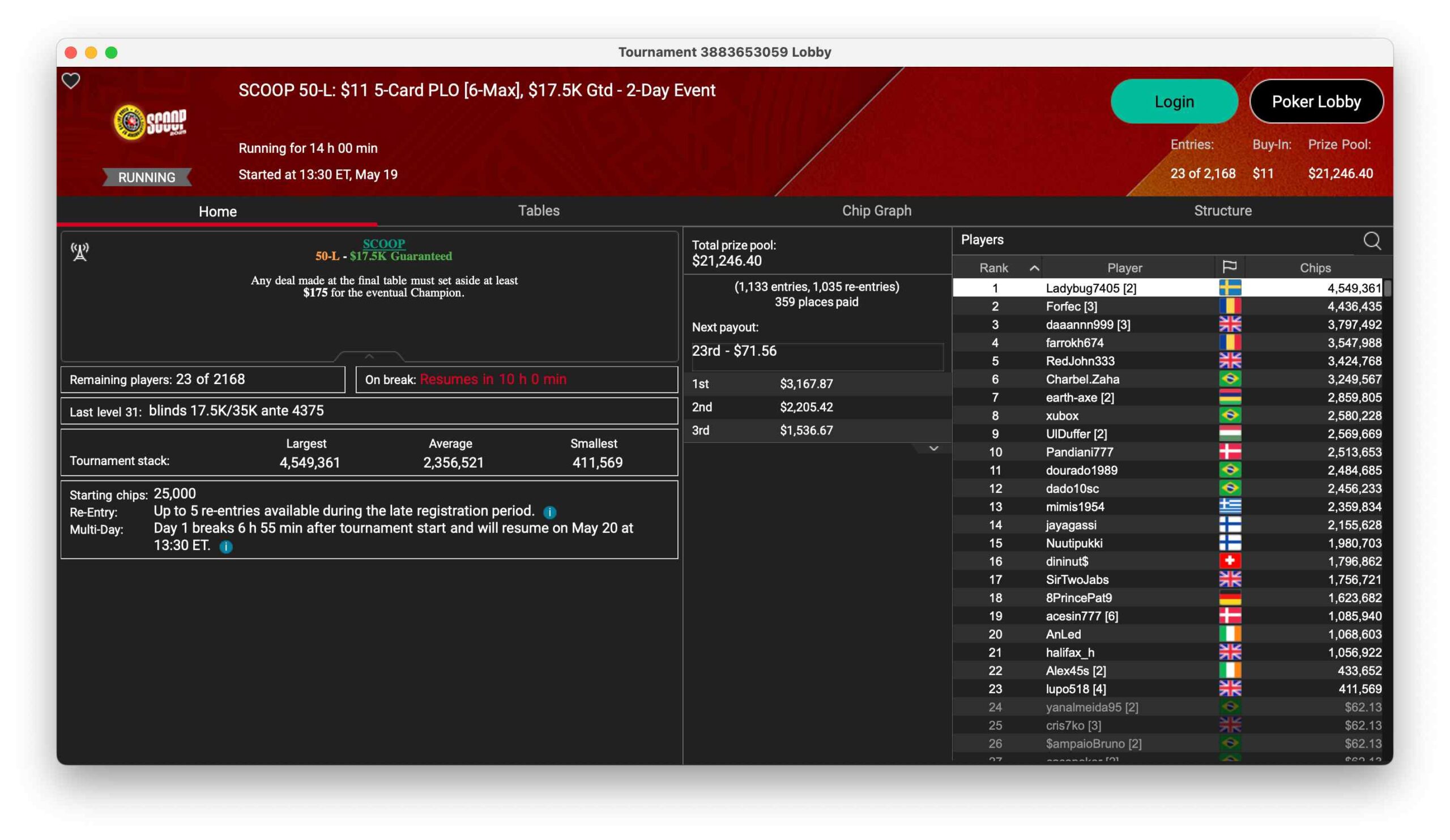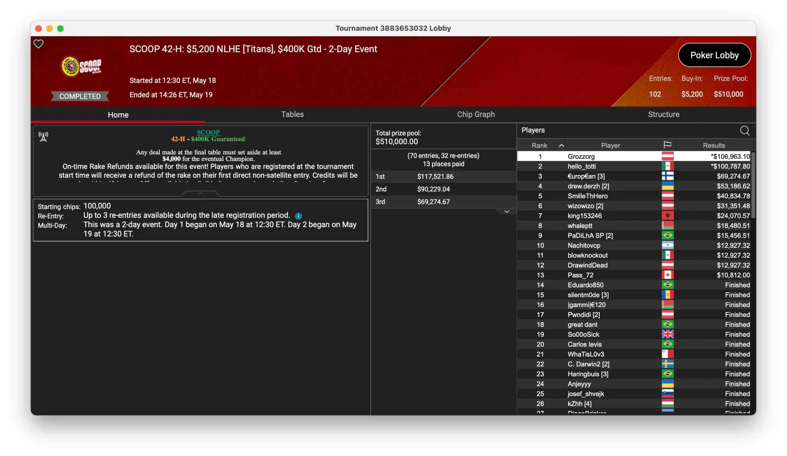 Im $5.200 SCOOP NLHE Titans mit 102 Entries und $502.000 Preispool konnte Leo „Grozzorg“ Maue sich durchsetzen. Er einigte sich mit „hello_totti“ im Heads-Up auf einen Deal, der ihn zum Sieger für $106.963 machte.