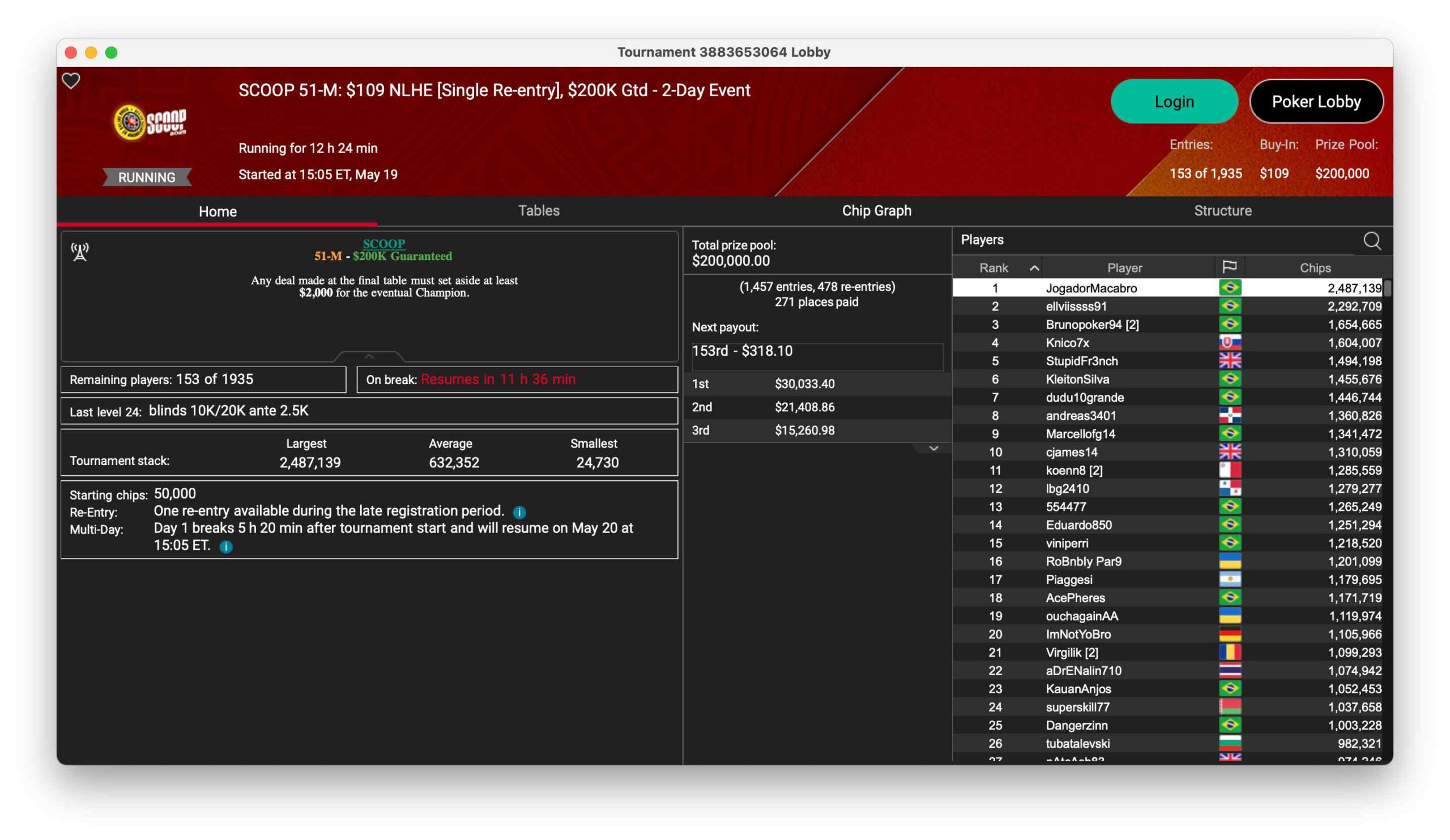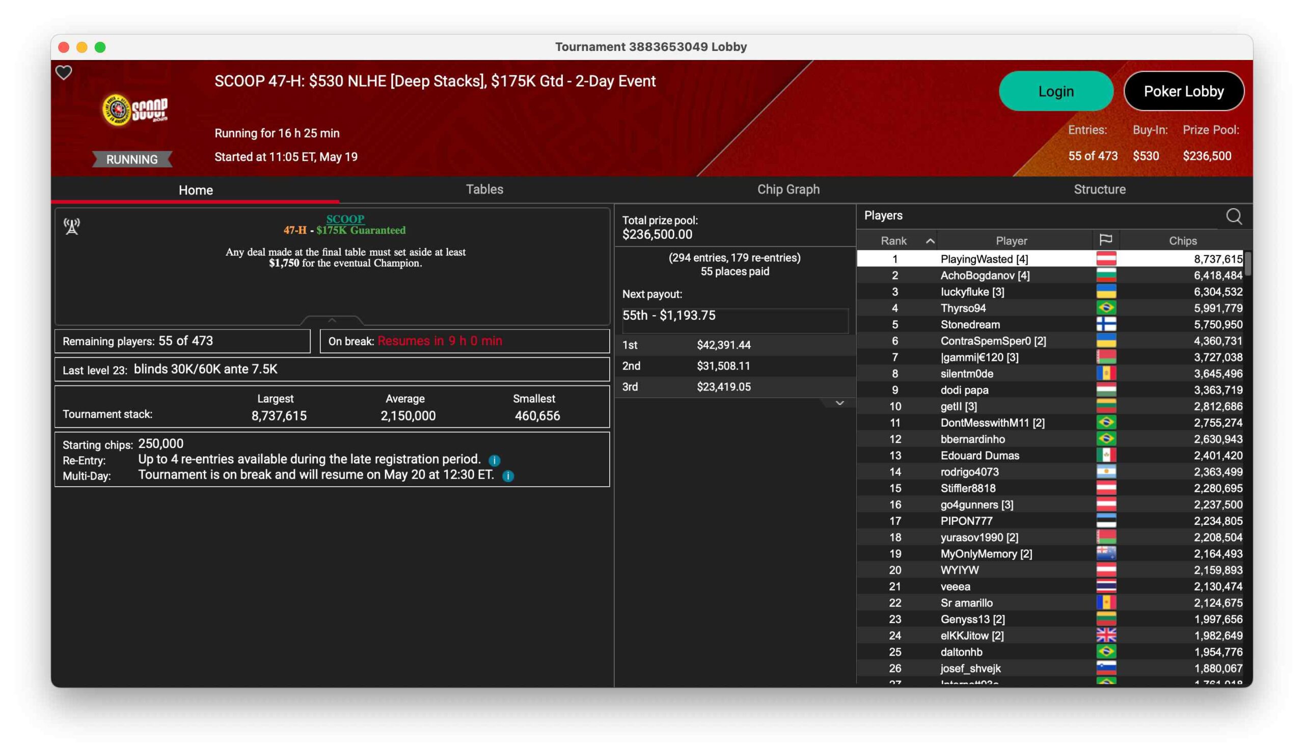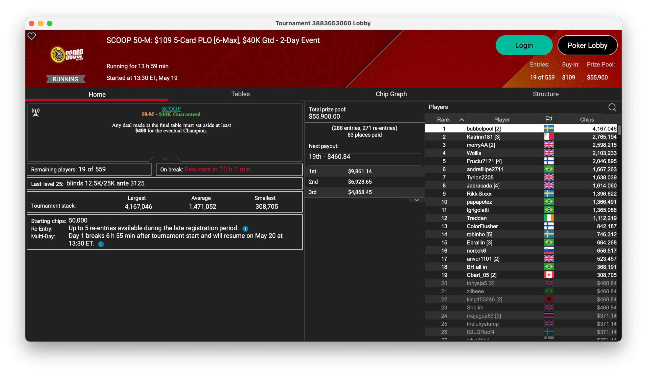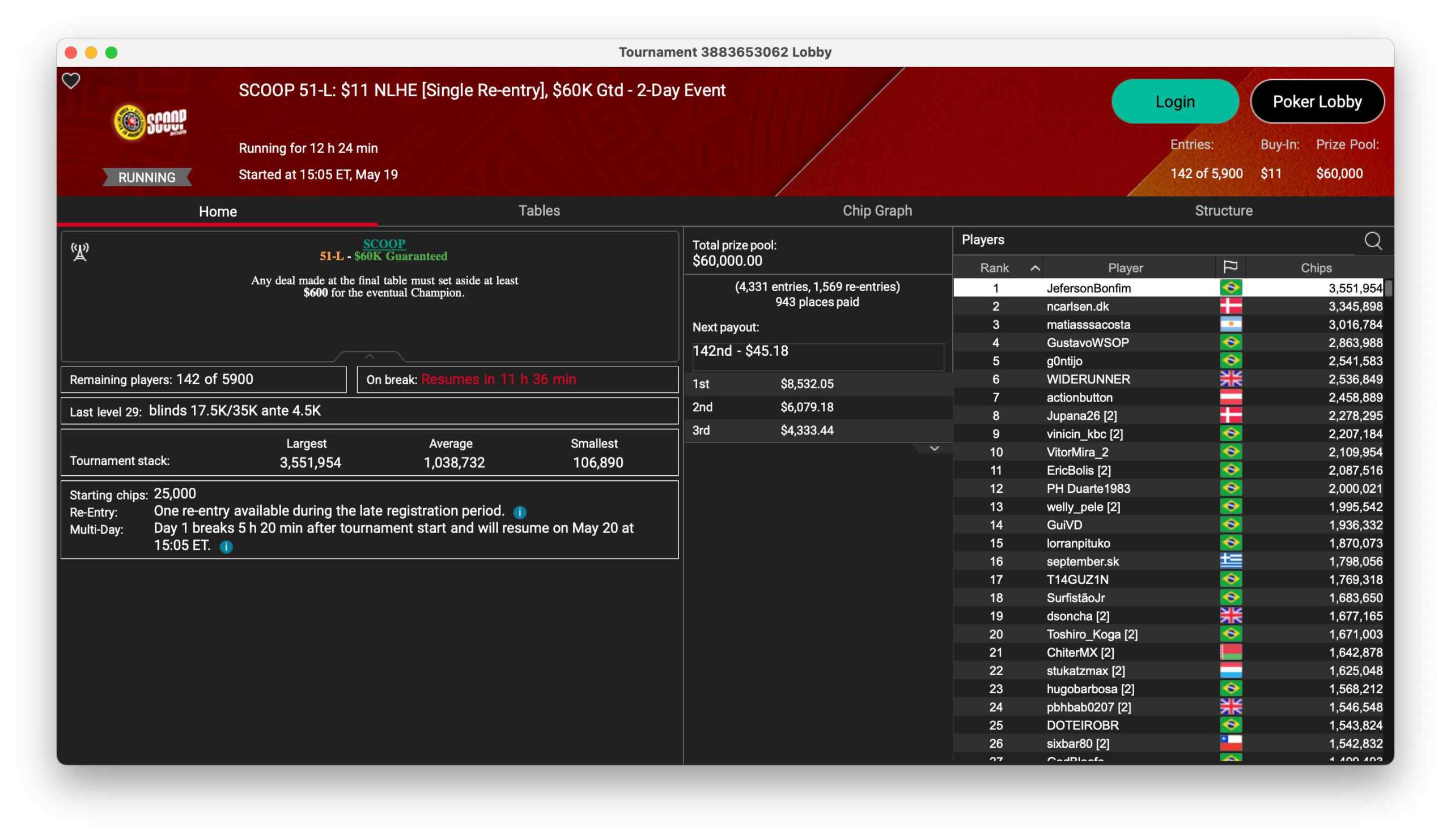 Im $5.200 SCOOP NLHE Titans mit 102 Entries und $502.000 Preispool konnte Leo „Grozzorg“ Maue sich durchsetzen. Er einigte sich mit „hello_totti“ im Heads-Up auf einen Deal, der ihn zum Sieger für $106.963 machte.