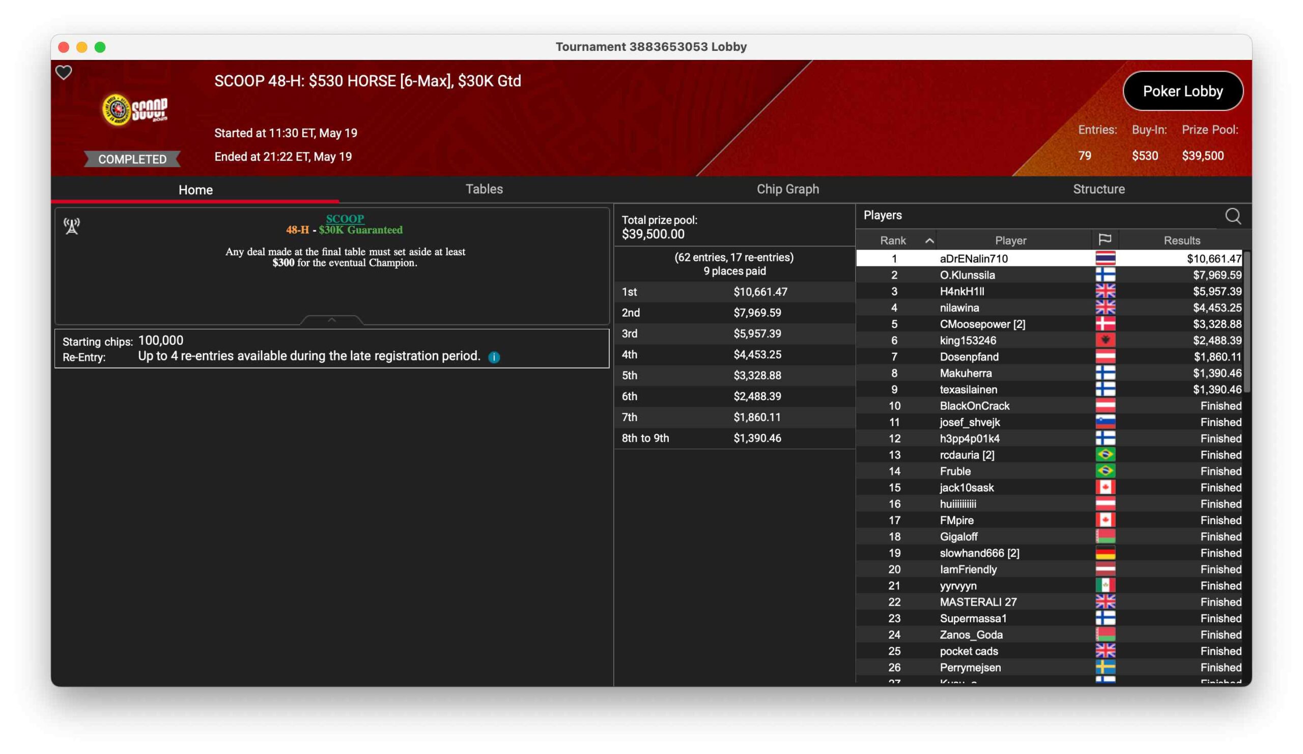 Im $109 HORSE mit 278 Entries spielte sich der Österreicher „Ac-King00“ an die Spitze. Mit $5.290 wurde Platz 1 belohnt.