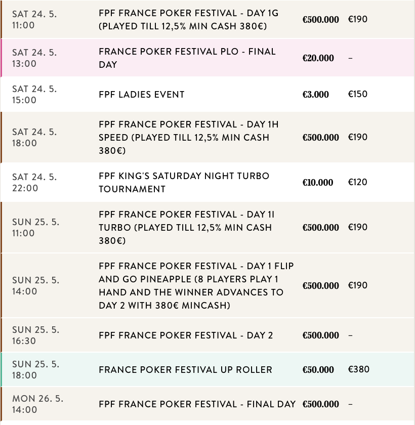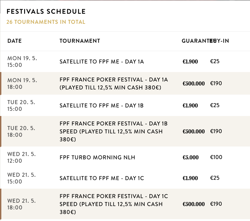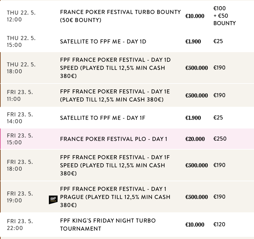 Das France Poker Festival Main Event bietet insgesamt zehn Starttage (neun in Rozvadov und einen in Prag) und ein Flip & Go für die Chance, sich für den Tag 2 am Sonntag, den 25. Mai zu qualifizieren. Das Finale des Turniers findet dann am Montag, den 26. Mai statt.
