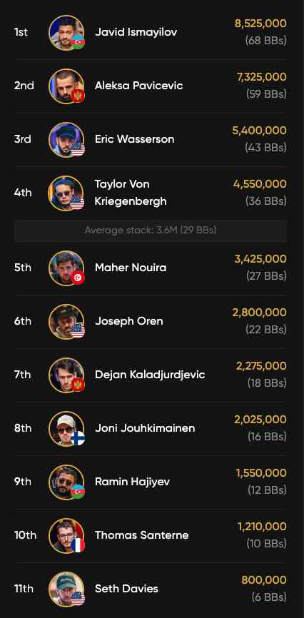Javid Ismayilov führt das Feld mit 8,5 Mio. Chips an, gefolgt von Aleksa Pavicevic mit 7,3 Mio. Chips.