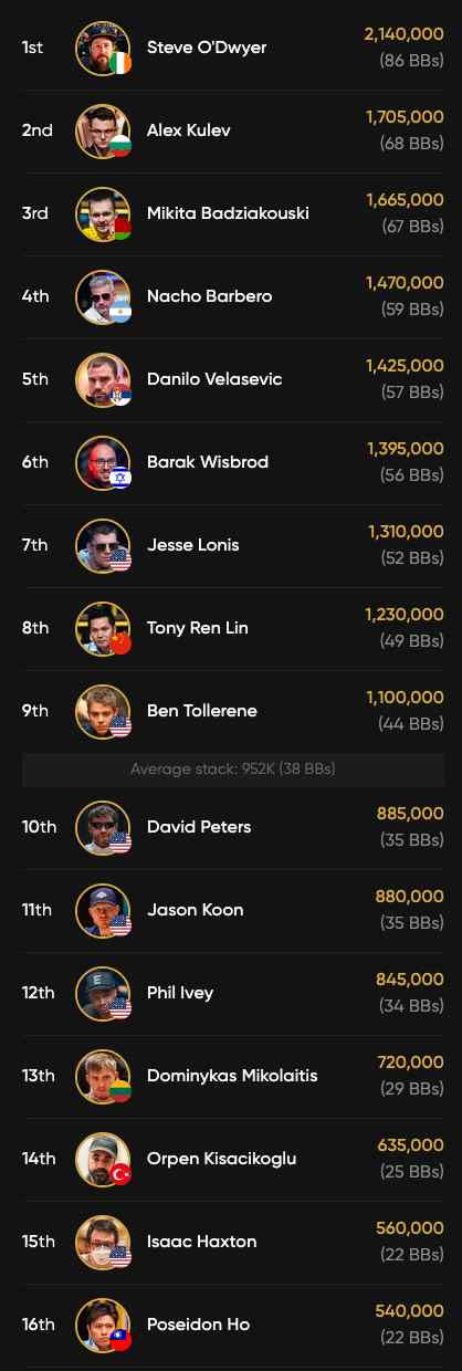 Alex Kulev ist mit 1,7 Mio. Chips hinter ihm, dicht gefolgt von Mikita Badziakouski mit 1,66 Mio. Chips.