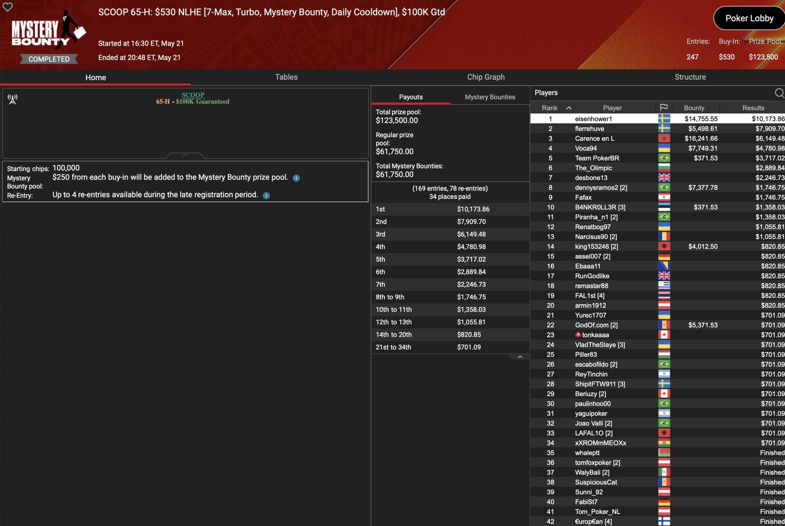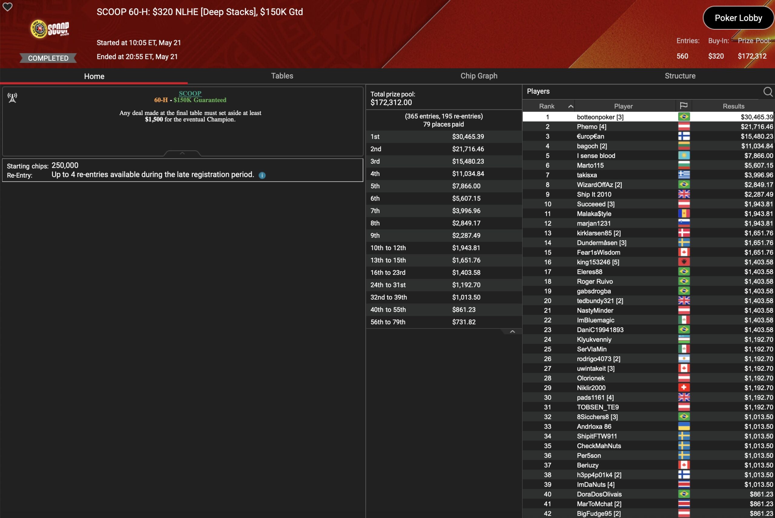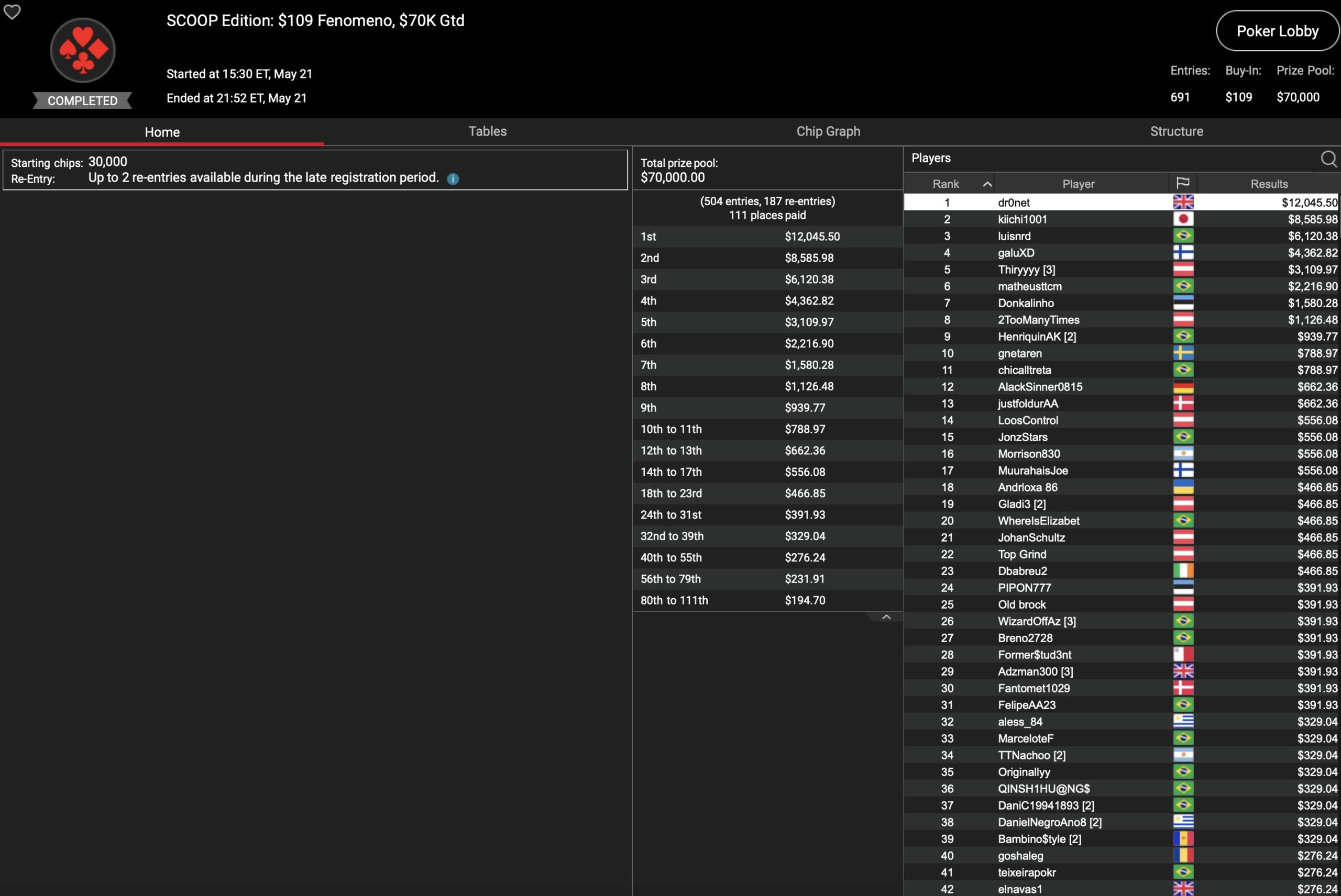 Auch die SCOOP Editions waren am Mittwoch ein gutes Pflaster für die Spieler aus der D-A-CH-L-Region. In der SCOOP Edition vom $215 StacKOsaurus landeten unter 326 (265+61) Entrys „ShoveShova“ als 8. ($842+$50) und der allseits bekannte „AdrianS_2506“ als 4. ($1.480+$362,50) am Final Table. In der SCOOP Ausgabe vom Big $109 war es niemand Geringeres als Tom „tomfoxpoker“ Fuchs, der anscheinend eine Auszeit bei der Triton SHRS Montenegro nutzte, um das Online Turnier anzuwerfen – mit Erfolg! Als Runner-Up unter 753 (564+189) Entrys machte er aus seinem Startgeld $9.265! Und auch im $109 Fenomeno gab es unter 691 (504+1987) Entrys zwei Final Table Casher aus Österreicher: „2TooManyTimes“ cashte als Achter $1.126, und „Thiryyyy“ nahm als 5. am Ende $3.109 mit.