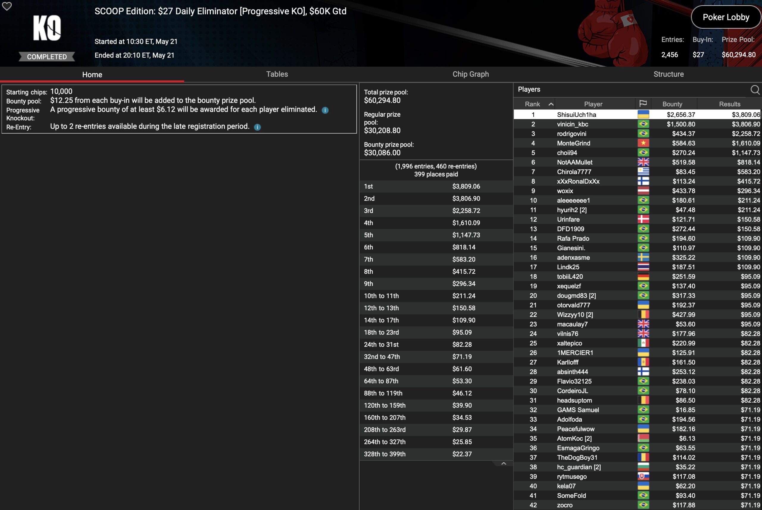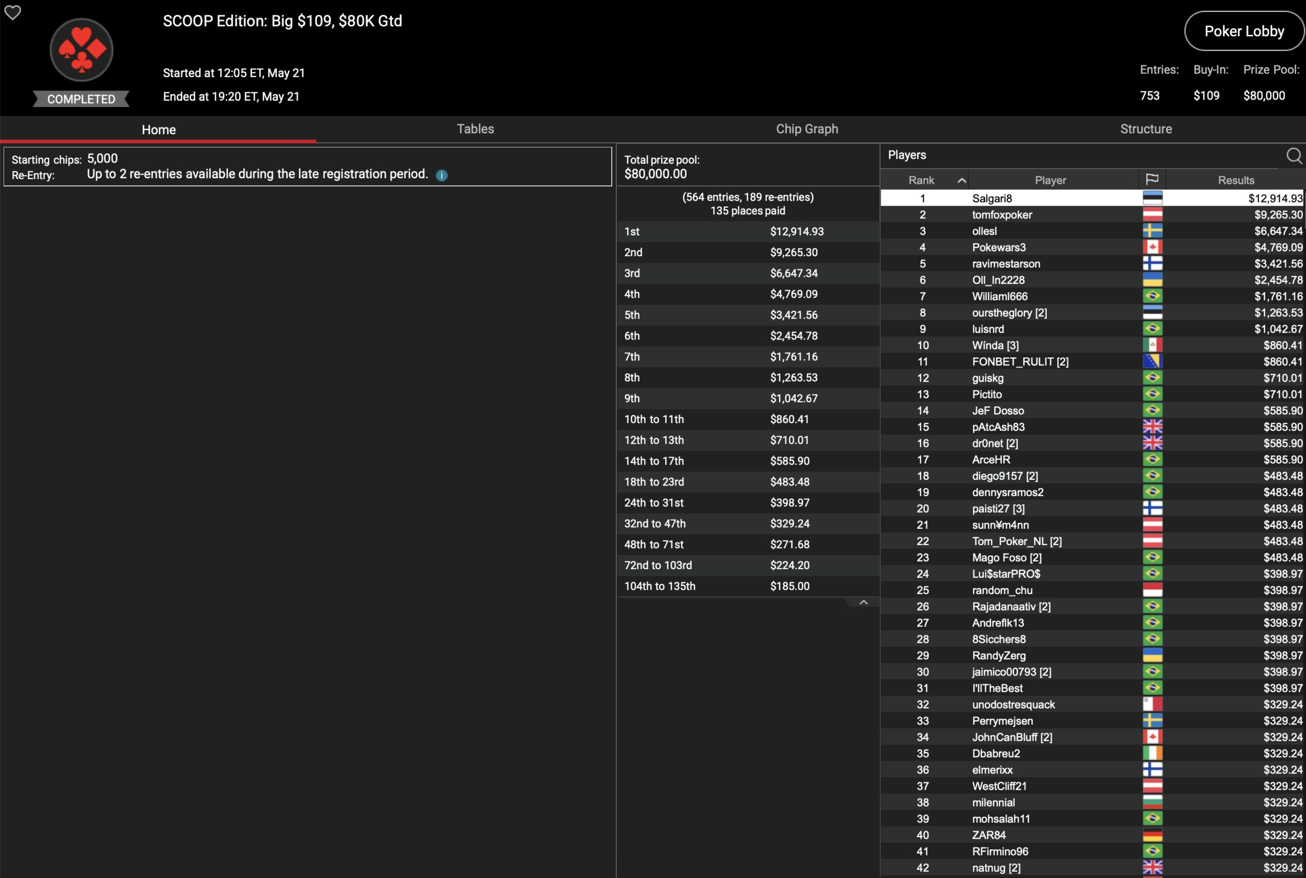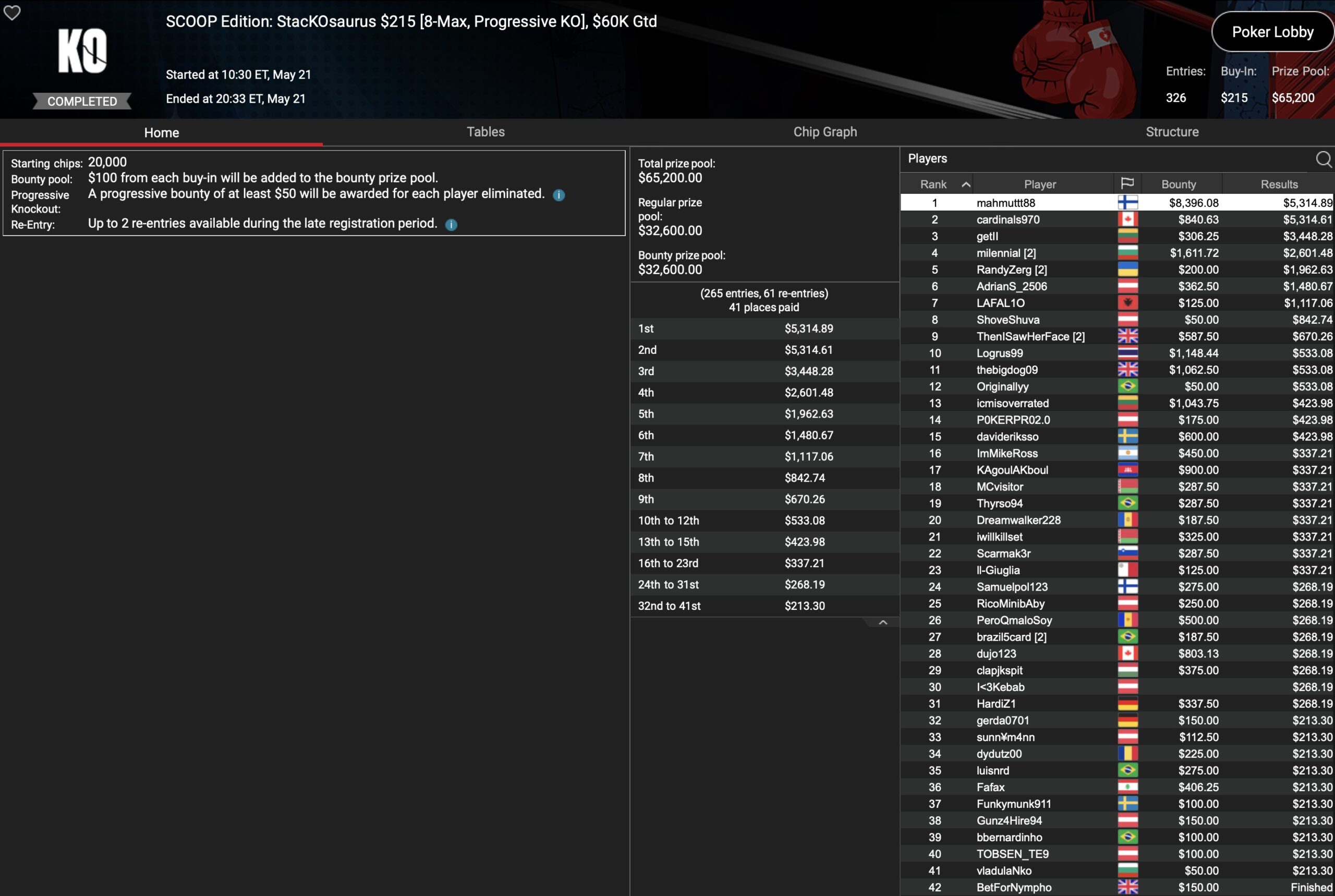 Auch die SCOOP Editions waren am Mittwoch ein gutes Pflaster für die Spieler aus der D-A-CH-L-Region. In der SCOOP Edition vom $215 StacKOsaurus landeten unter 326 (265+61) Entrys „ShoveShova“ als 8. ($842+$50) und der allseits bekannte „AdrianS_2506“ als 4. ($1.480+$362,50) am Final Table. In der SCOOP Ausgabe vom Big $109 war es niemand Geringeres als Tom „tomfoxpoker“ Fuchs, der anscheinend eine Auszeit bei der Triton SHRS Montenegro nutzte, um das Online Turnier anzuwerfen – mit Erfolg! Als Runner-Up unter 753 (564+189) Entrys machte er aus seinem Startgeld $9.265! Und auch im $109 Fenomeno gab es unter 691 (504+1987) Entrys zwei Final Table Casher aus Österreicher: „2TooManyTimes“ cashte als Achter $1.126, und „Thiryyyy“ nahm als 5. am Ende $3.109 mit.