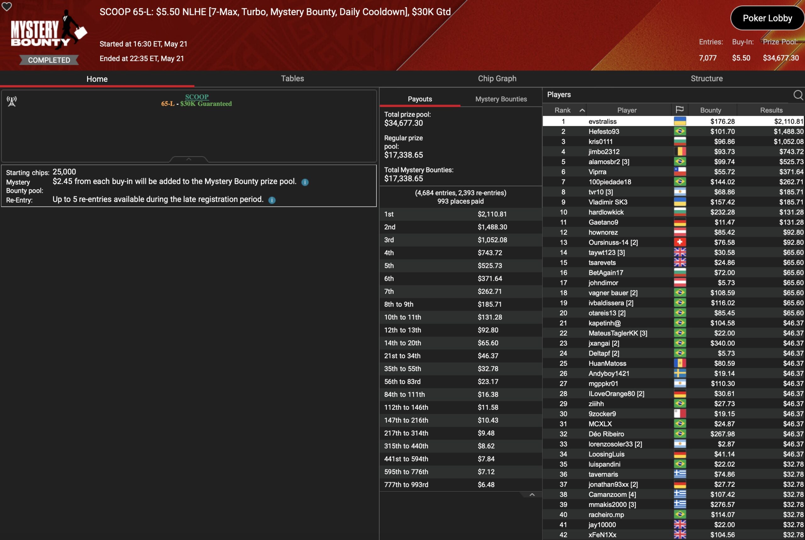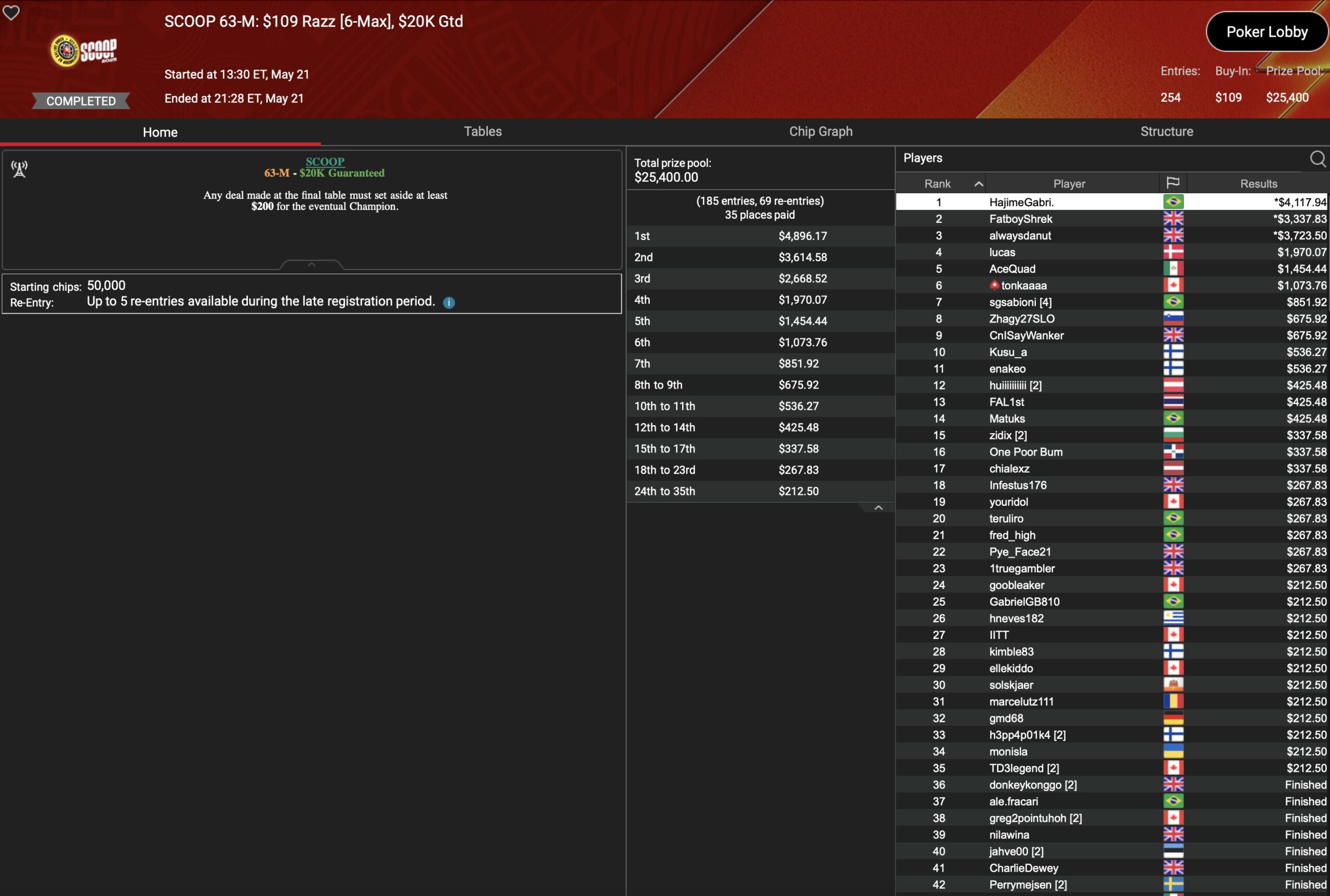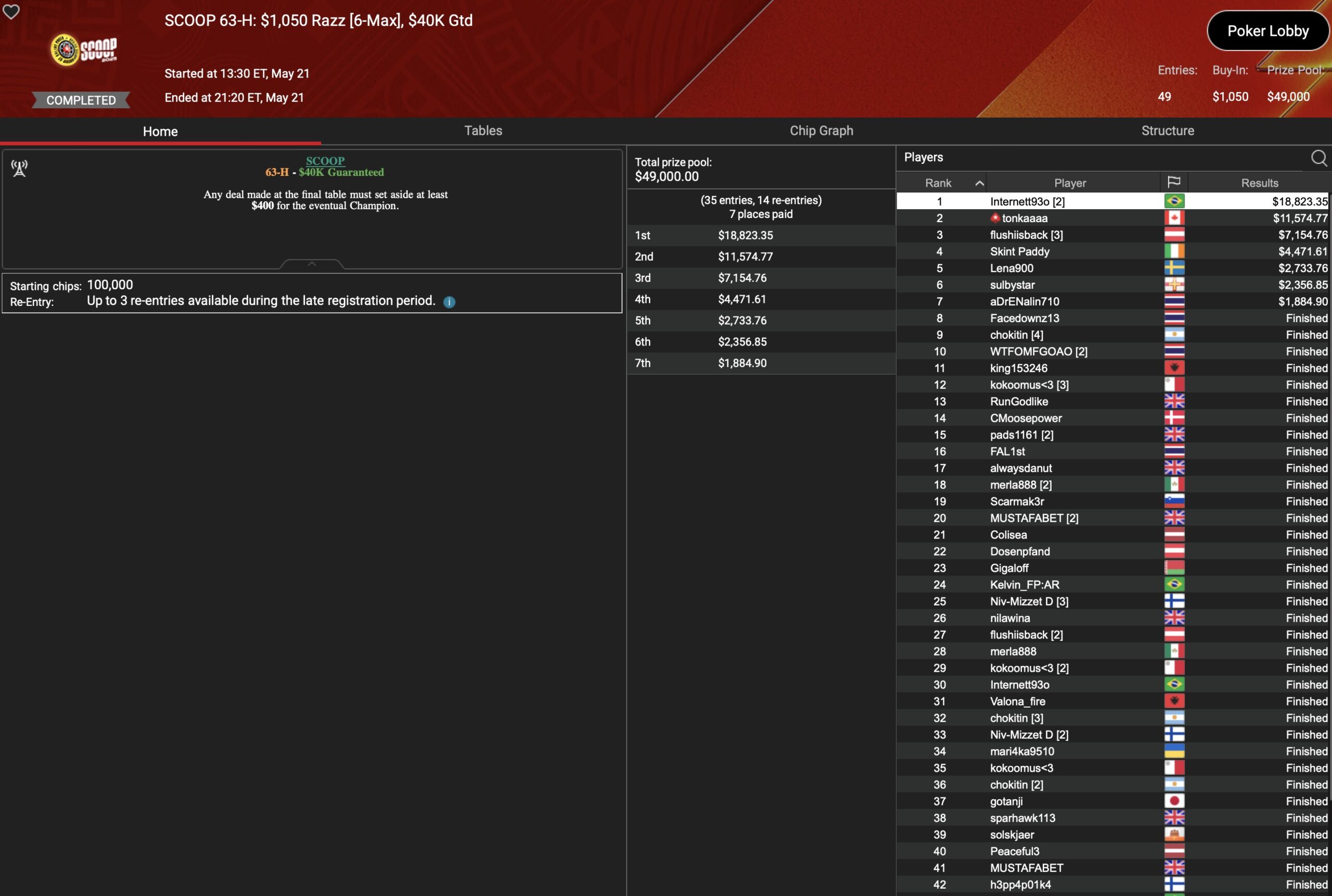 Im Razz Evenbt (#63) traten die Mixed Game Spezialisten auf den Plan. Da durfte natürlich auch Niclas „flushiisback“ Thumm nicht feheln, der außerdem fließig SCOOP League Punkte sammelte. In der $11 Low-Ausgabe konnte der Runner-Up der „Dare2Stream“ Challenge Rang 2 unter 847 Runnern belegen und verpasste die SCOOP-Trophy nur knapp. Ähnliches galt für „EdBighead911“ aus Deutschland auf Rang 4. Auch in der $1.050 High-Ausgabe (#63-H) des Razz Events lief es gut für Thumm. In einem etwas elitäreren Feld von 49 (35+14) Entrys konnte der Wahl-Österreicher einen großen Teil des Poker Who-is-Whos hinter sich lassen. Am Ende rankten nur der brasilianische Sieger „Internett93o“ und der PokerStars Ambassador Parker „tonkaaaa“ Talbot vor ihm. Rang 3 war neben vielen Punkten für das SCOOP League Team außerdem $7.154 für „flushiisback“ Wert.