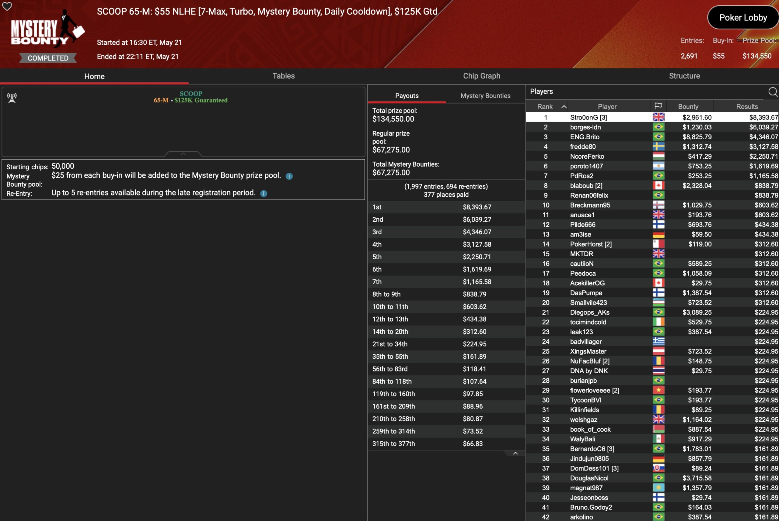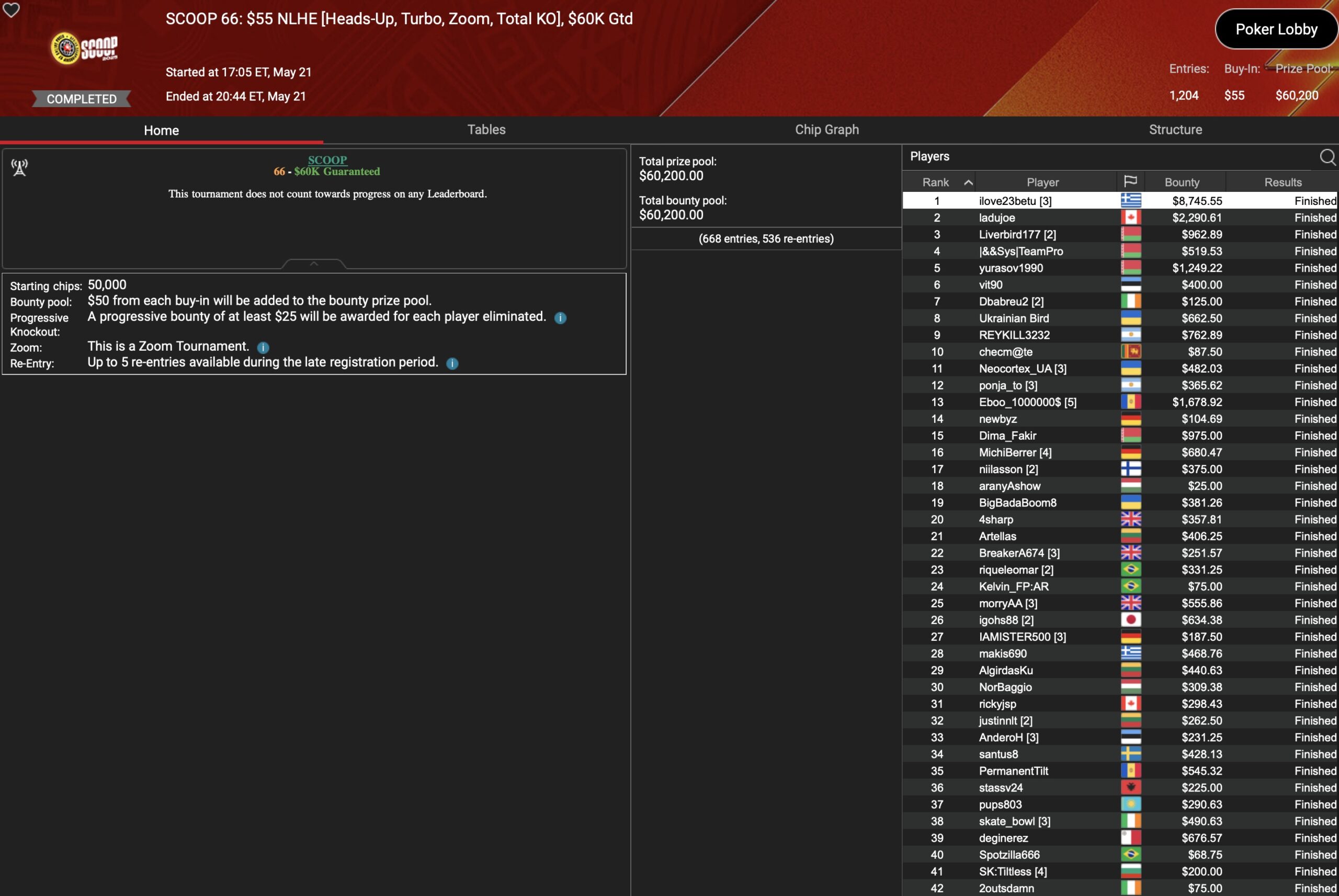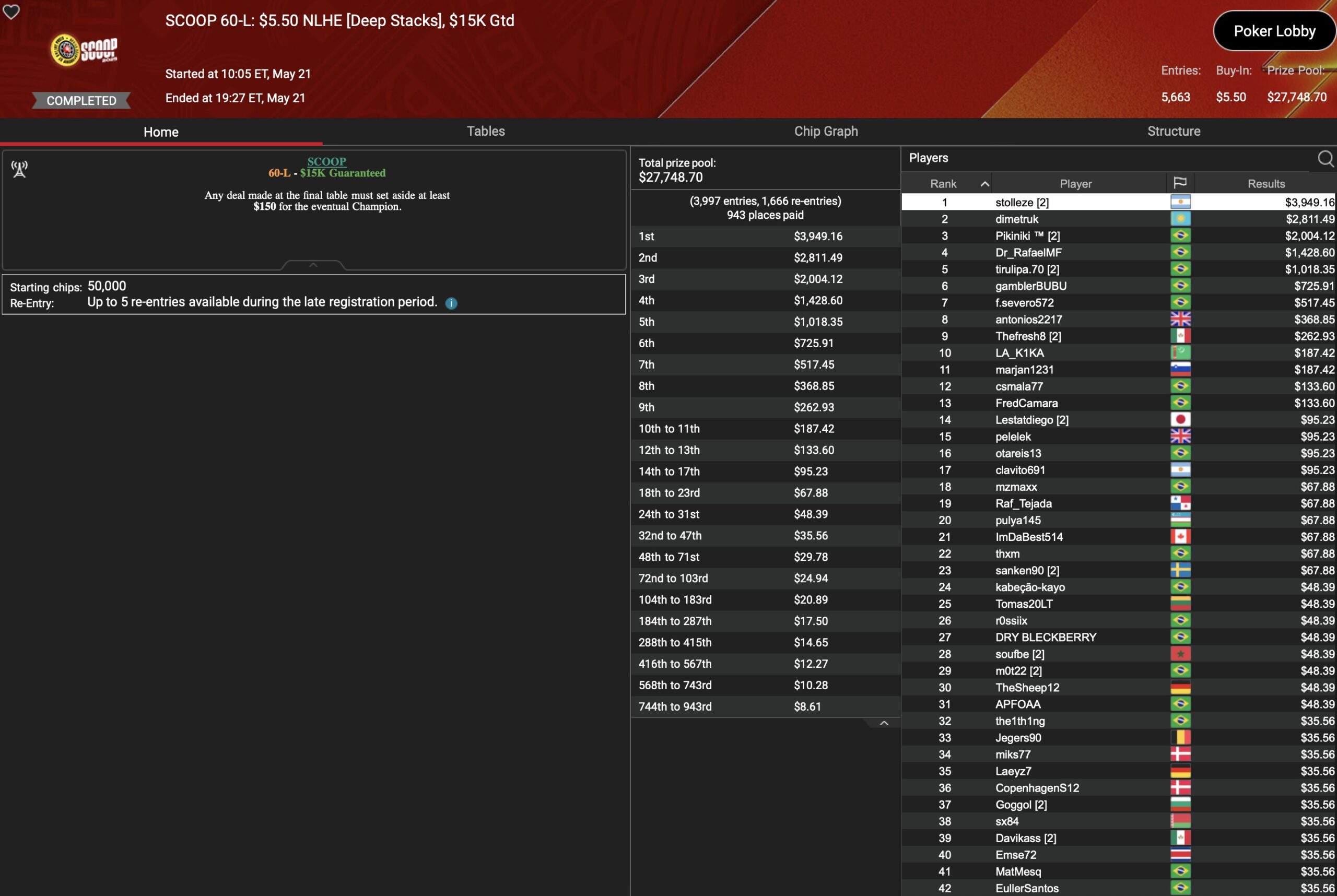 Im Razz Evenbt (#63) traten die Mixed Game Spezialisten auf den Plan. Da durfte natürlich auch Niclas „flushiisback“ Thumm nicht feheln, der außerdem fließig SCOOP League Punkte sammelte. In der $11 Low-Ausgabe konnte der Runner-Up der „Dare2Stream“ Challenge Rang 2 unter 847 Runnern belegen und verpasste die SCOOP-Trophy nur knapp. Ähnliches galt für „EdBighead911“ aus Deutschland auf Rang 4. Auch in der $1.050 High-Ausgabe (#63-H) des Razz Events lief es gut für Thumm. In einem etwas elitäreren Feld von 49 (35+14) Entrys konnte der Wahl-Österreicher einen großen Teil des Poker Who-is-Whos hinter sich lassen. Am Ende rankten nur der brasilianische Sieger „Internett93o“ und der PokerStars Ambassador Parker „tonkaaaa“ Talbot vor ihm. Rang 3 war neben vielen Punkten für das SCOOP League Team außerdem $7.154 für „flushiisback“ Wert.
