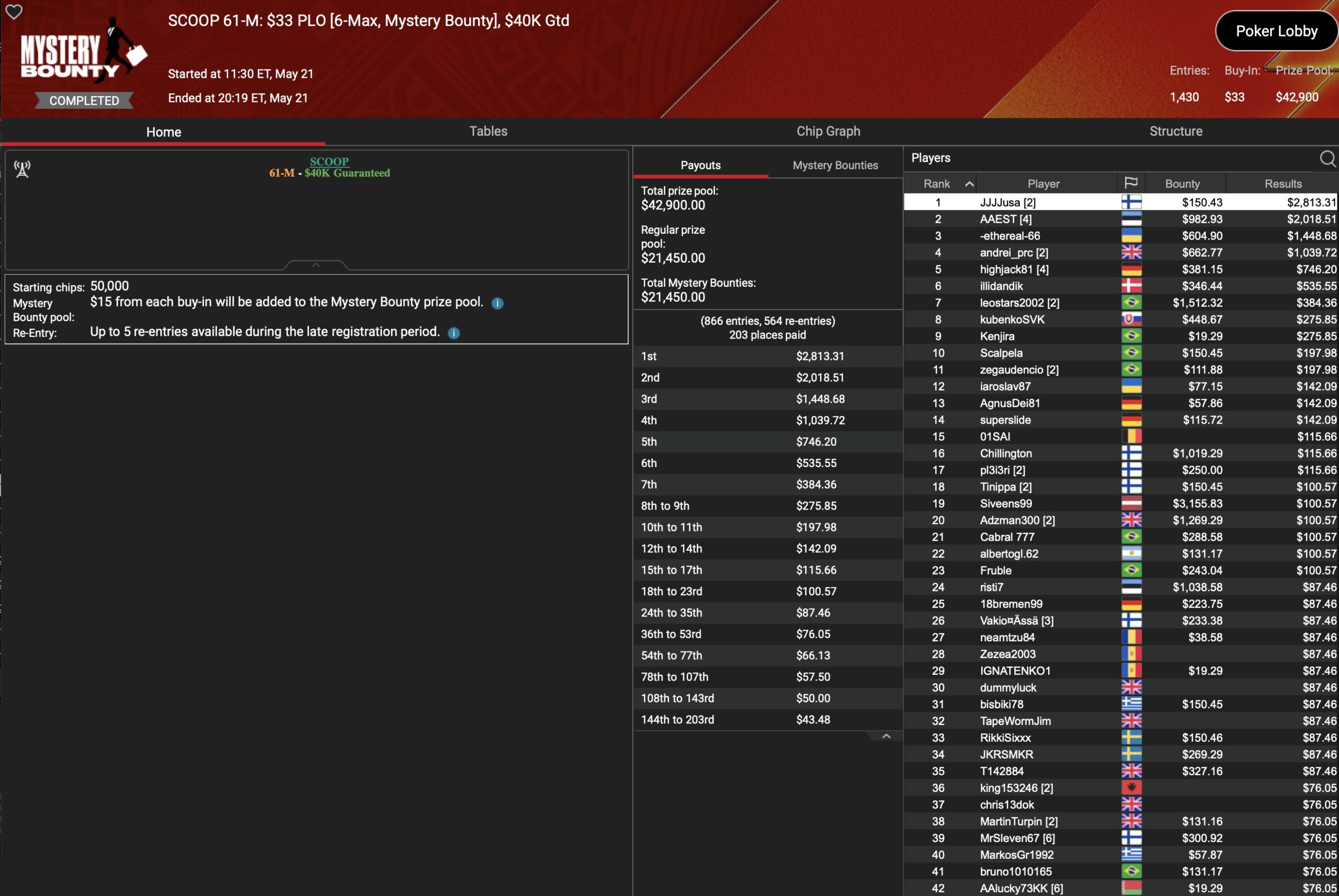 In der $33 Medium-Ausgabe des PLO Mystery Bounty Events war es „highjack81“ aus Deutschalnd der unter 1.430 Entrys 5. wurde, in der $320 High-Ausgabe (#61-H) landete „HYBRID400“ als 7. von 29 Entrys am finalen Tisch.