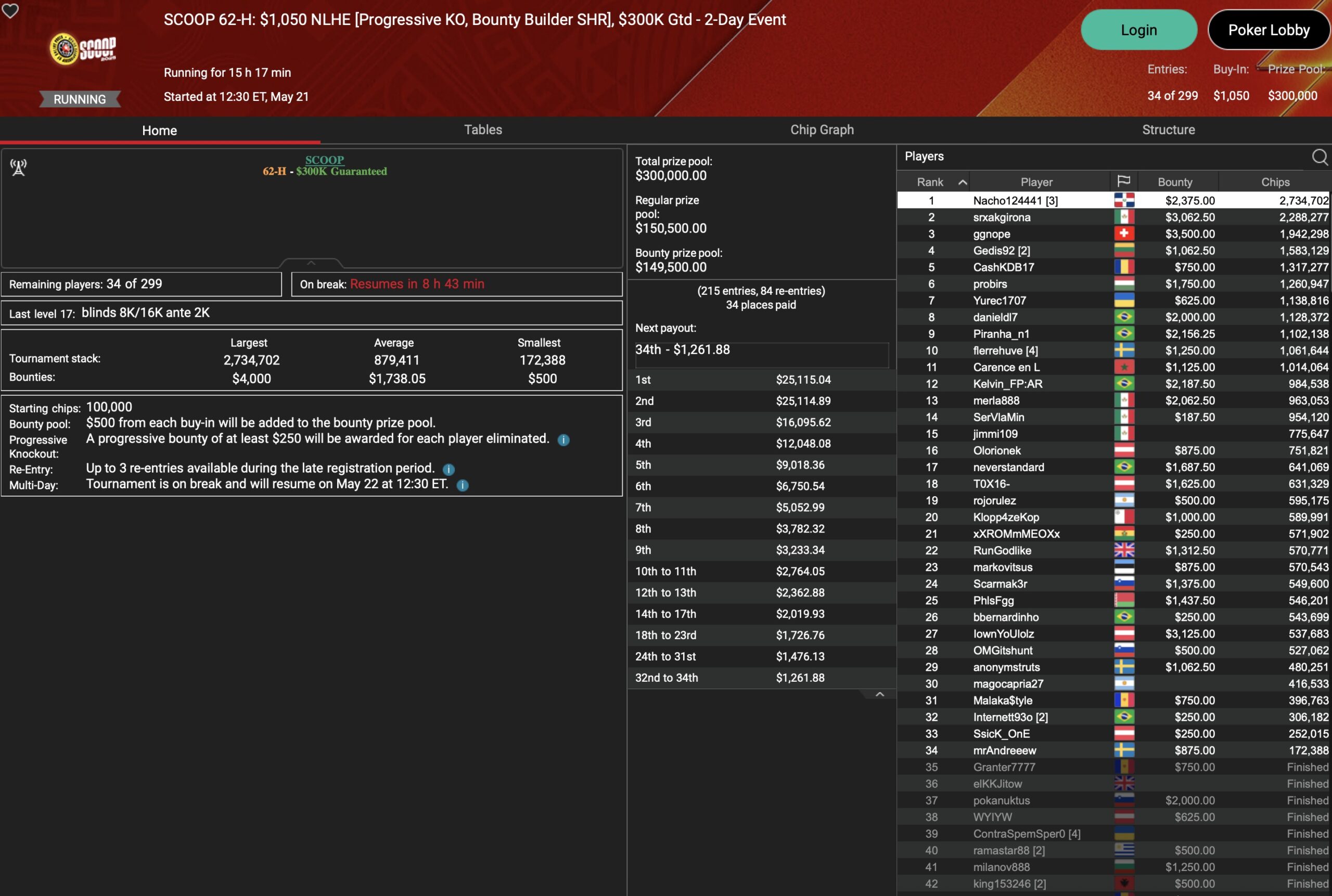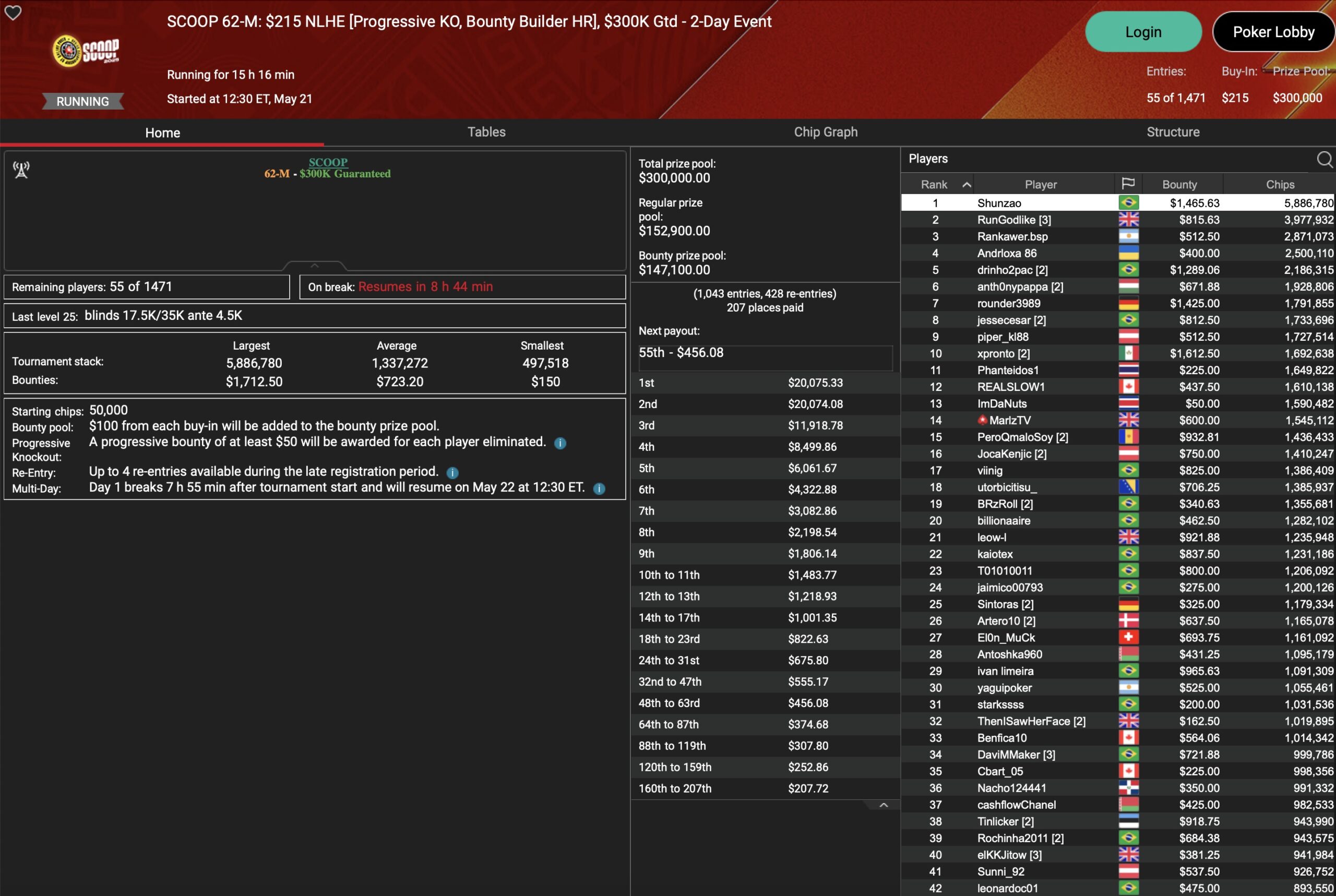 Auch für den heutigen Donnerstag sind die Aussichten auf einen deutschsprachigen Deeprun gut. Im $55 Mini Bounty Builder (#62-L) liegt „PuercoRicoo“ aus der Schweiz als 4. von 84 der ursprünglichen 4.521 Entrys hervorragend im Rennen um große Teile aus dem $226.050 Gesamtpreispool. Im $215 Bounty Builder HR (#62-M) ist „rounder3989“ unter den letzten 55 von 1.471 u.a. zusammen mit „Sintoras“, „piper_kl88“, „JocaKenjic“, „El0n_MuCk“ oder Josef „Sunni_92“ Schusteritsch weiter im Rennen um die Payouts und PKO-Bountys aus dem mit $300.000 garantierten Preispool. Und im $1.050 Bounty Builder SHR (#62-H) halten „ggnope“ als 3. im Chipcount der letzten 34 von 299 Entrys, sowie „Olorionek“, „T0X16-„, „IownYoUlolz“ und Claas „SsicK_OnE“ Segebrecht die deutschsprachigen Hoffnungen aufrecht. – Im Medium-Event liegt im übrigen niemand Geringeres als SCOOP-Rekordsieger Benny „Rungodlike“ Glaser als 2. im Count in Lauerstellung auf seinen nächsten Titel.