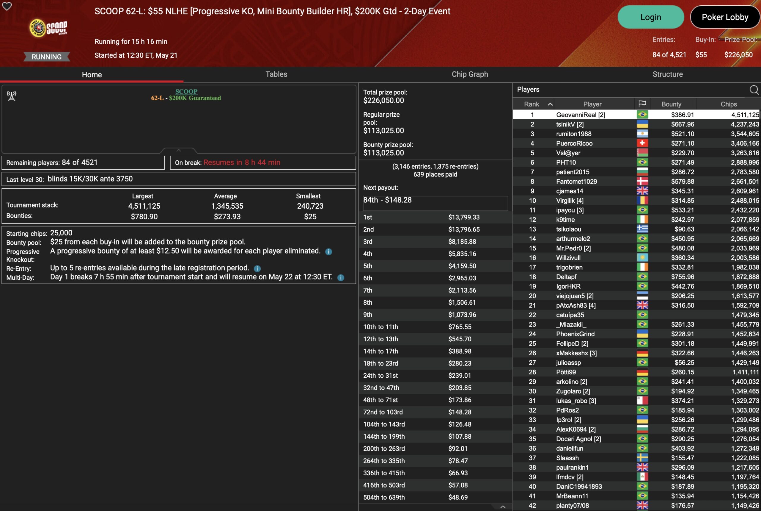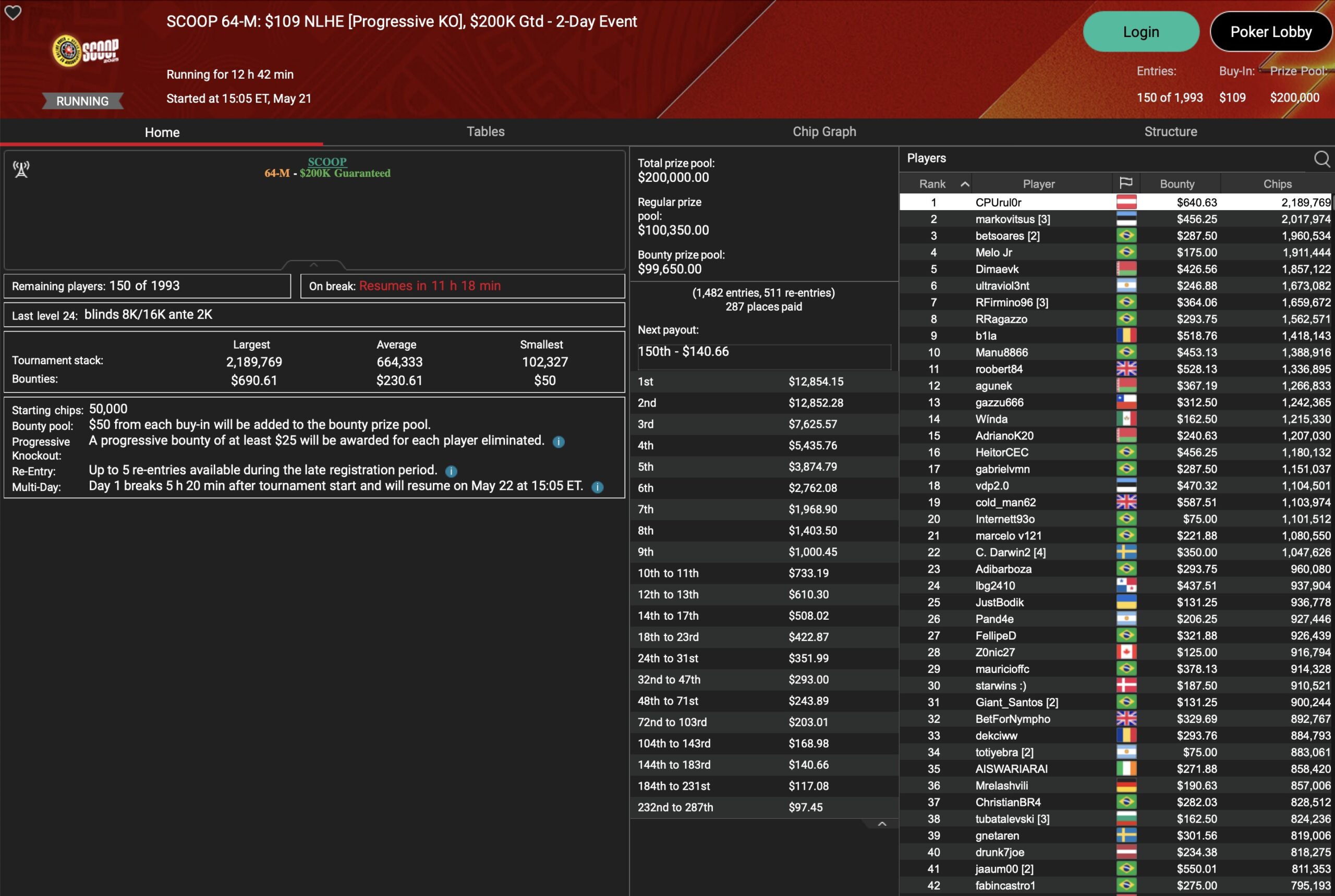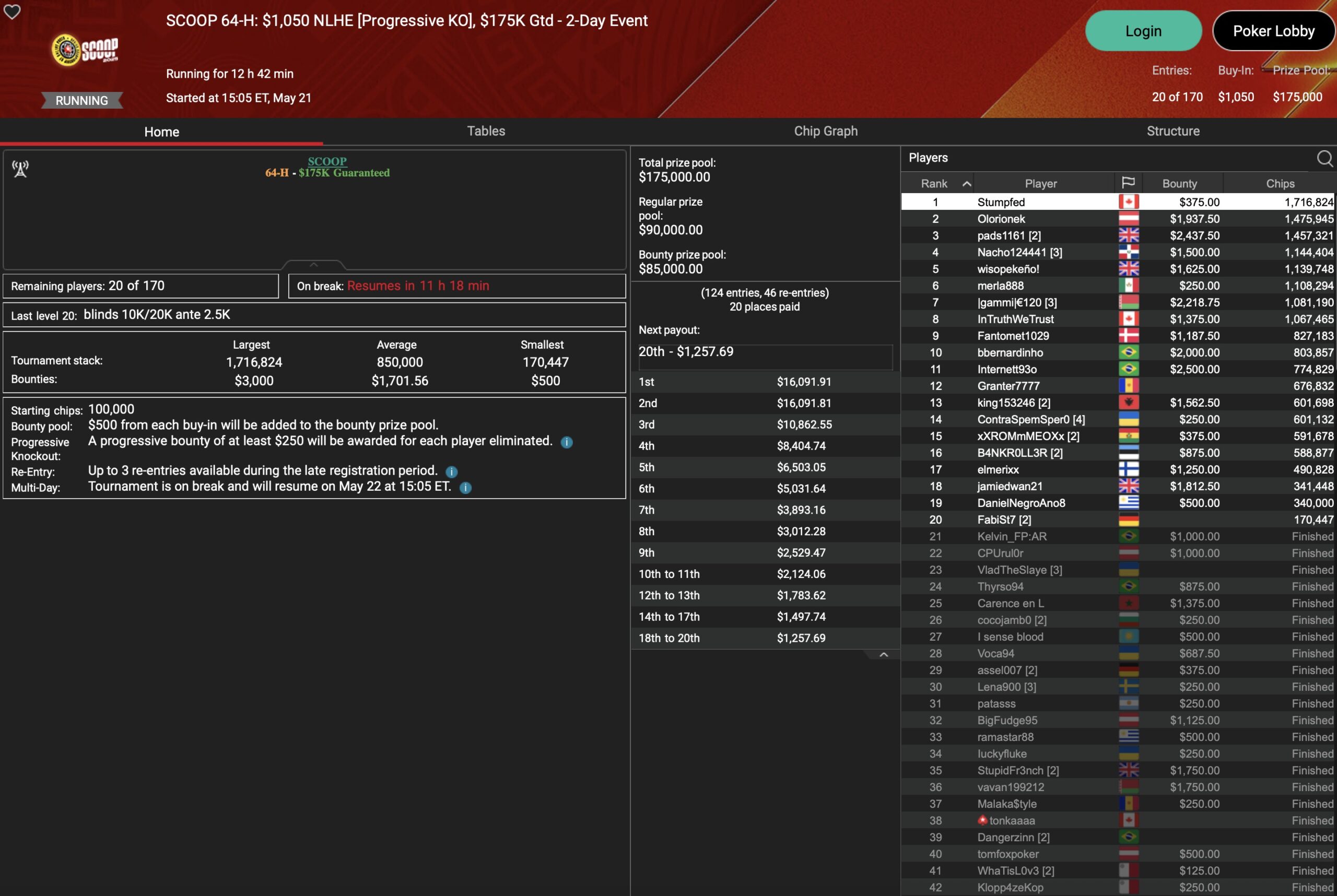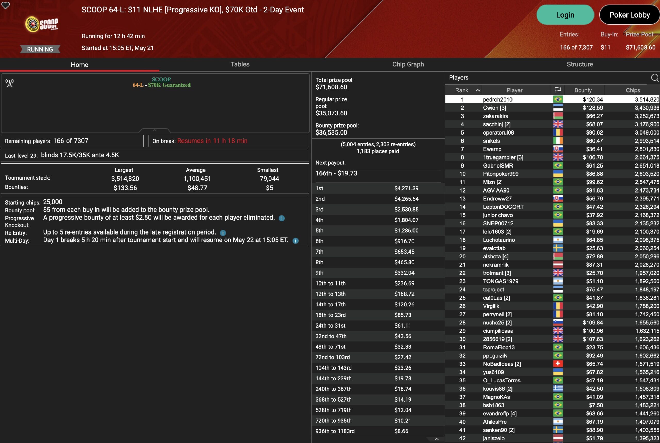Die beste Ausgangsposition der deutschsprachigen Community hat sich Christopher „CPUrul0r“ Pütz erarbeitet. Der MTT-Crusher konnte als Chipleader der von 1.993 verbleibenden 150 Finalisten im $109 NLHE PKO (#64-M) übernachten. $200.000 liegen hier im Gesamtpreispool, der zur Hälfte aus regulären, zur Hälfte aus PKO-Bounty-Payouts besteht. In der High-Ausgabe des selben Turniers liegt der polnische Wahlösterreicher Jakub „Olorionek“ Michalak auf Rang 2 im Chipcount der letzten 20 Spieler, Shortstack ist „FabiSt7“ aus Deutschland.