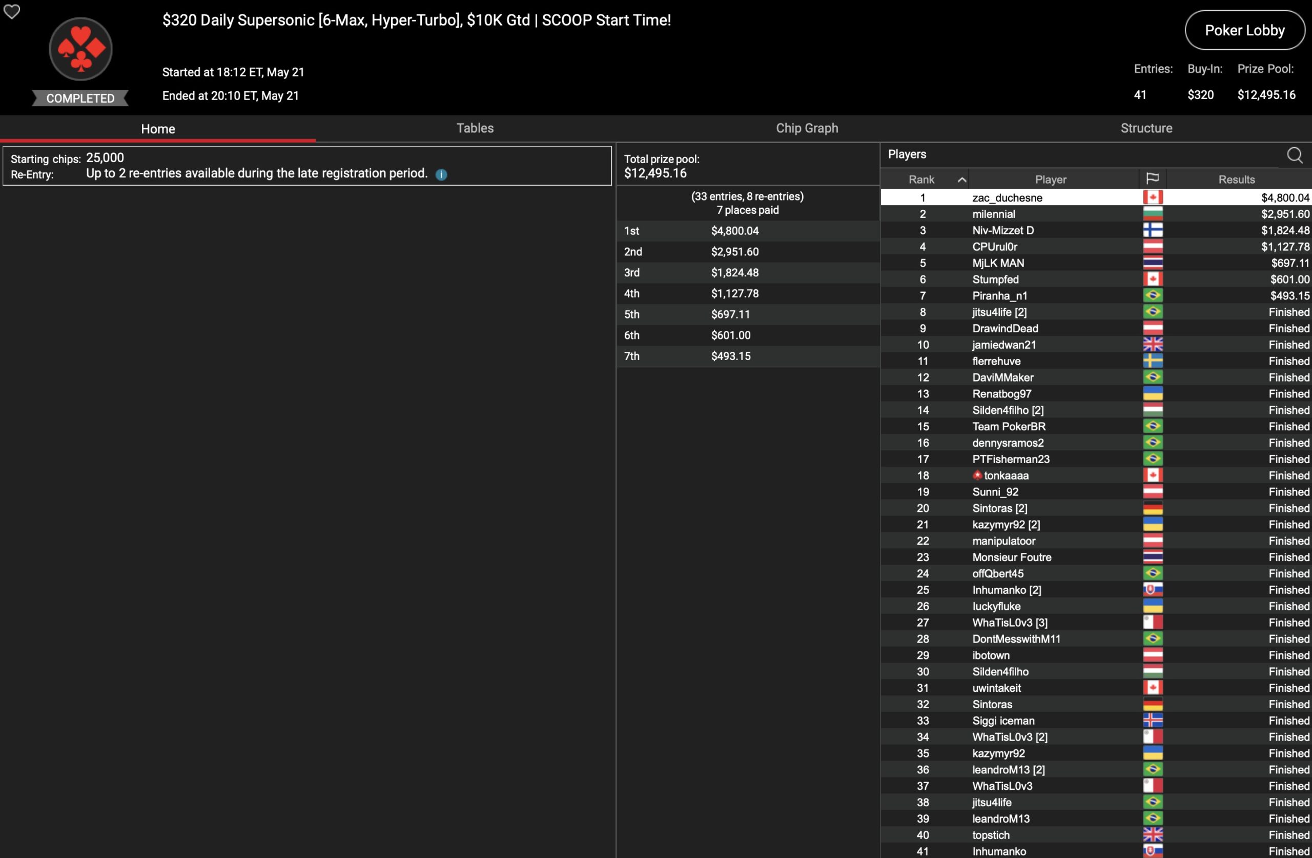 Im einzigen High Roller Turnier des Tages, das nicht im Rahmen der SCOOP stattfand konnte der Christopher „CPUrul0r“ Pütz als 4. von 41 (33+8) Entrys im $320 Daily Supersonic $1-127 cashen. Der Sieg ging zusammen mit $4.800 Siegprämie aus dem $12.495 Preispool an „zac_duchesne“ aus Kanada.