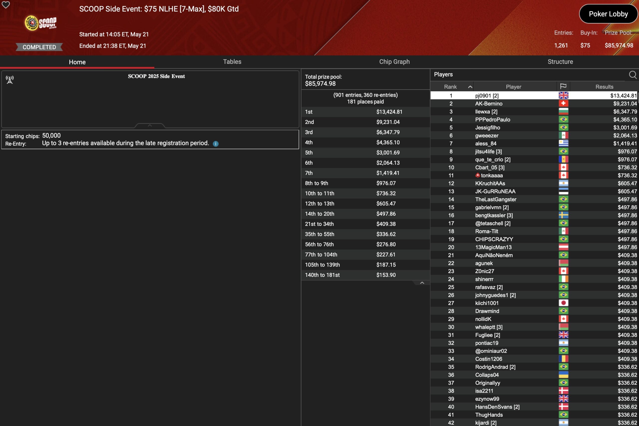 Beinahe wäre der einzige SCOOP Side Event mit dem $75 NLHE auch in die D-A-CH-Region gegangen. Erst im Heads-Up nach 7 Stunden 33 Minuten Spielzeit musste sich „AK-Bernino“ aus der Schweiz unter 1.261 Teilonahmen „pj0901“ aus Großbritannien geschlagen geben. Der Lohn dafür: $9.231 Payout.