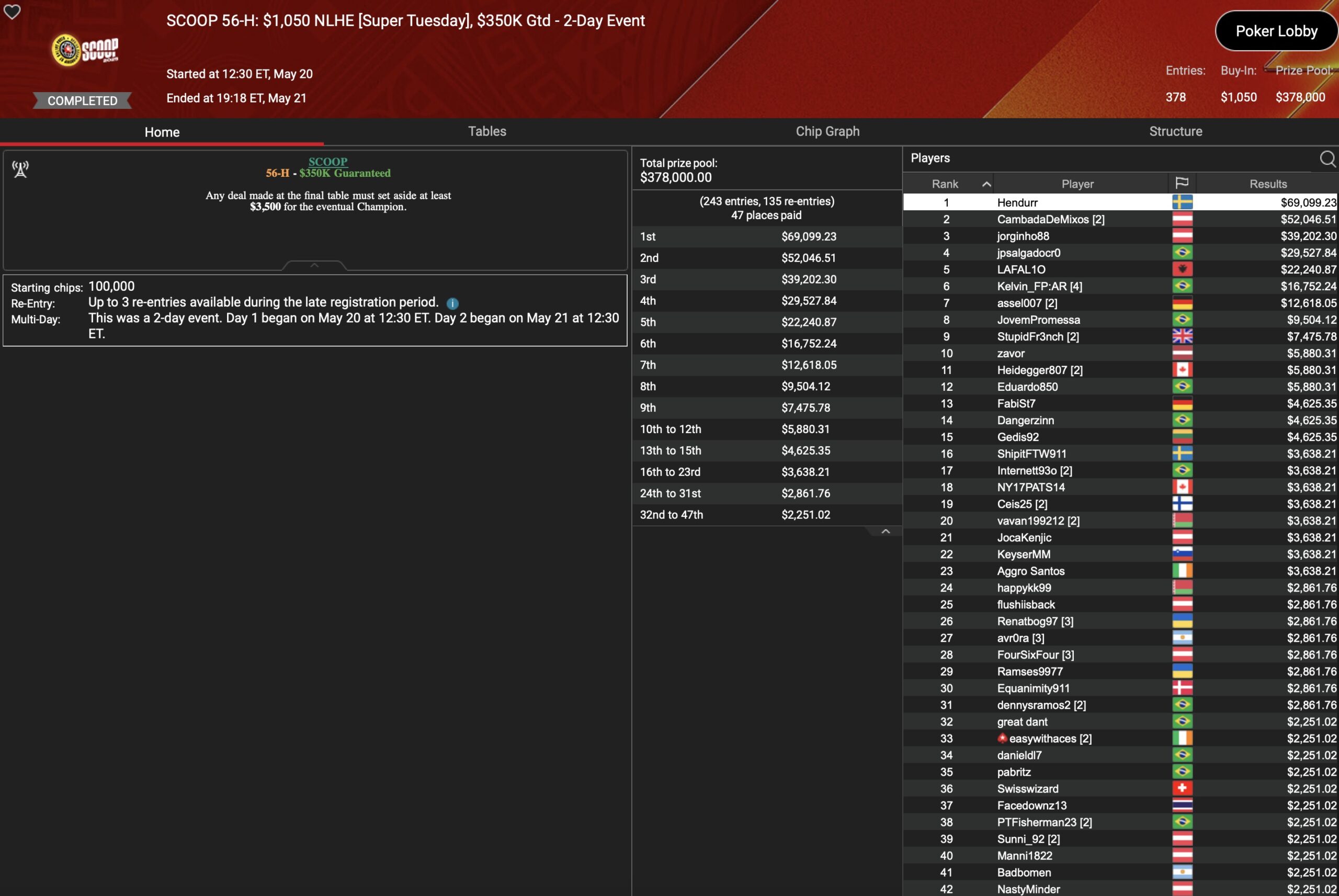 Im eigentlichen Super Tuesday mit $1.050 Buy-In war es „Hendurr“ aus Schweden, der für $69.099 Top-Payout am Ende die Wahl-Österreicher „CambadaDeMixos“ und Jorge „jorginho88“ Abreu auf die Plätze 2 ($52.046) und 3 ($39.202) verwies. Der deutsche Neo-Highroller „assel007“ kassierte als Siebter $12.618.