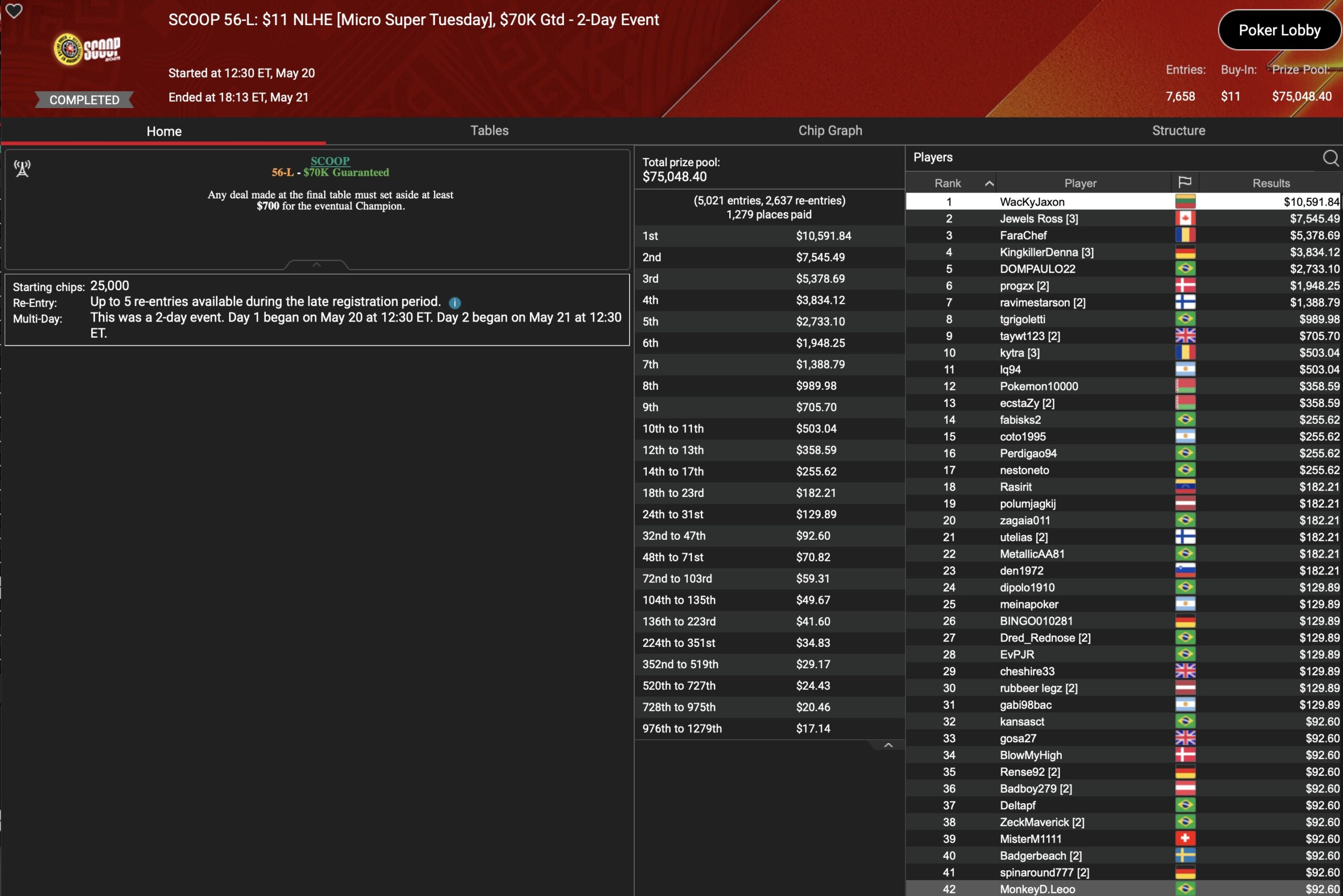 Im $11 Micro Super Tuesday (#56-L) war es „KingKillerDenna“ aus Deutschland, der unter 7.658 Entrys auf Rang 4 landete, was mit $3.834 belohnt wurde. Den Sieg und $10.591 Siegprämie holte „WacKyJaxon“ aus Lettland.