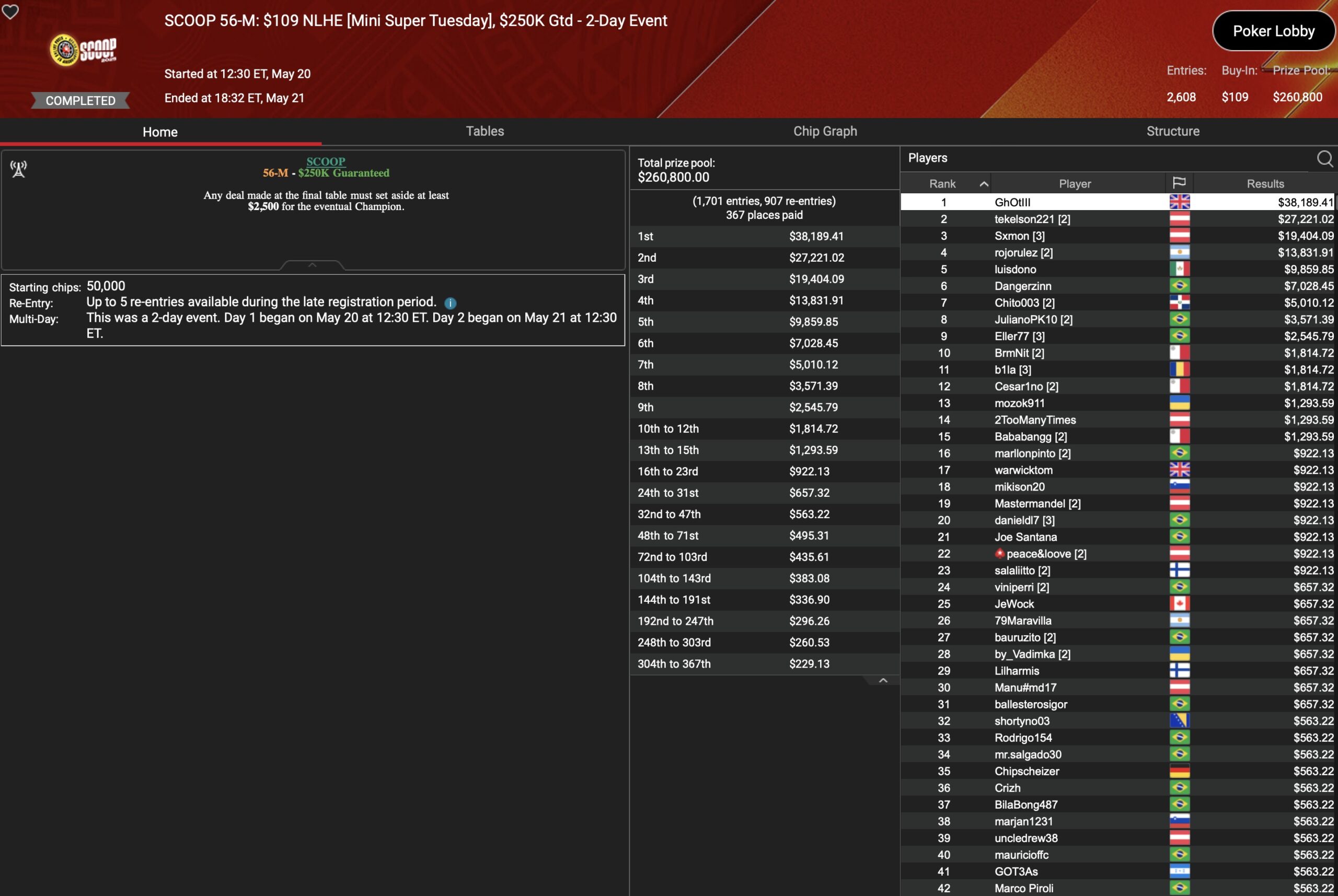 Im $109 Mini Super Tuesday (#56-M) schafften sowohl „tekelson221„, als auch „Sxmon“ aus Österreich als 2. ($27.221) und Dritter ($19.404) unter 2.608 Entrys den Sprung aufs Podium. Sieger für $38.189 wurde „GhOtlll“ aus Großbritannien.