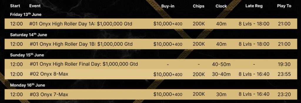 Vom 13. bis 16. Juni steht der legendäre Onyx Club im Merit Cyprus den Turnierspieler*innen für 3 Events offen. Alle 3 Turniere richten sich mit Buy-Ins von jeweils $10.000+$400 an High Roller. Für die $10,4k Startgeld, 4% + 2% werden für operative und Marketingzwecke noch aus den Buy-Ins genommen, erhält man in den 3 Turnieren jeweils 200.000 Starting Chips und immer 8 Level Zeit Late oder Re-Entrys während der Late Registration Phase zu nehmen.