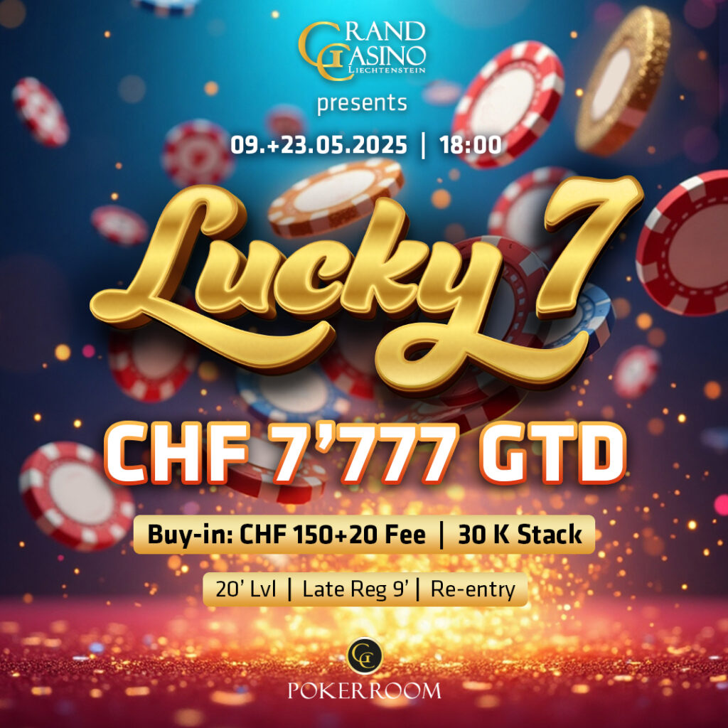 Heute geht es im Grand Casino Liechtenstein weiter mit dem CHF 150+20 Lucky 7 mit einer CHF 7.777 Garantie. Gespielt wird ab 18:00 Uhr mit 30.000 Start Stack und 20-Minuten Blind-Levels.