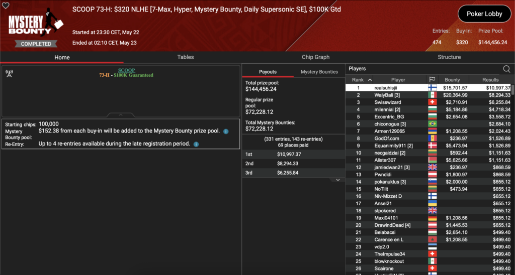 Das SCOOP 73-H: $320 NLHE Mystery Bounty ($100k GTD) wurde von einem weiteren Finnen bezwungen. Der $144.456 Preispool wurde von insgesamt 474 Entries gebildet und der Löwenanteil von $10.997 plus $15.701 an Bounties ging an ‚realsuhisjii‚.