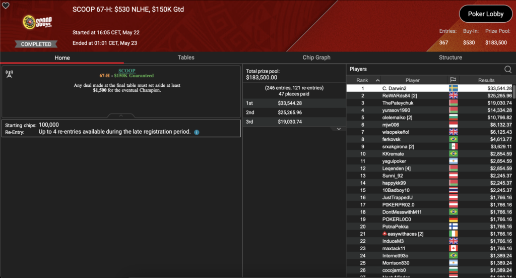 Im SCOOP 67-H: $530 NLHE ($150k GTD) kamen 367 Entries zusammen und schufen somit einen $183.500 Preispool. Über den Top-Preis von $33.544 konnte sich hier der Schwede ‚C. Darwin2‚ freuen.
