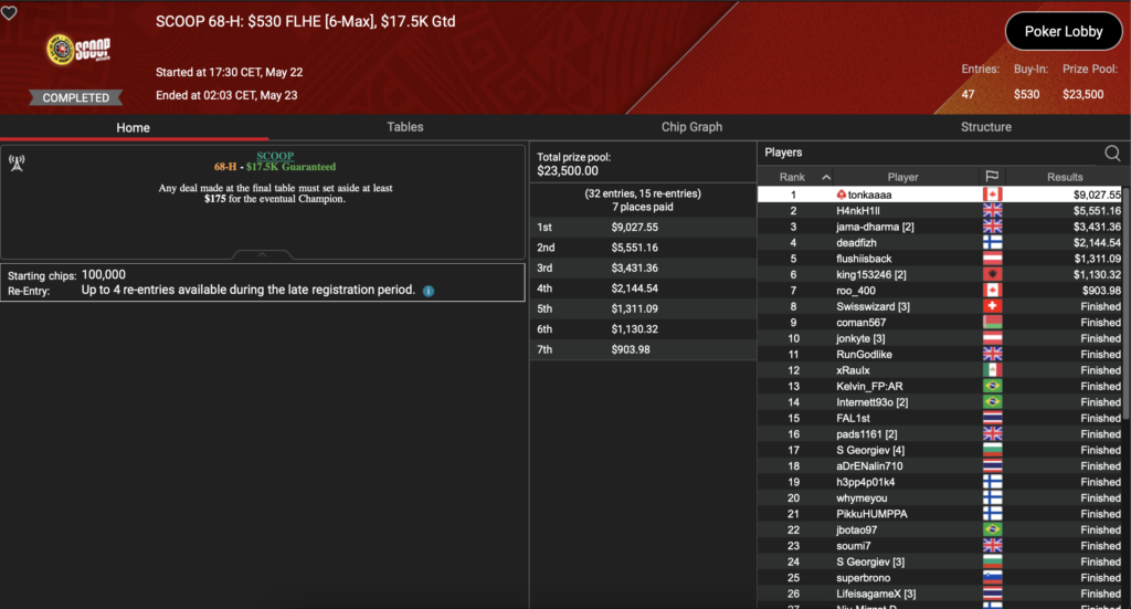 Das SCOOP 68-H: $530 FLHE 6-max ($17,5k GTD) lockte 32 Fixed Limit High Roller an die Tische, die zusätzlich noch für 15 Re-Entries bezahlten. Dies ergab einen Preispool von $23.500. Am Ende war es niemand Geringerer als der kanadische Poker-Profi und PokerStars-Ambassador Parker ‚tonkaaaa‘ Talbot, der den Top-Preis von $9.027 und somit einen SCOOP-Titel für sich beanspruchen konnte.