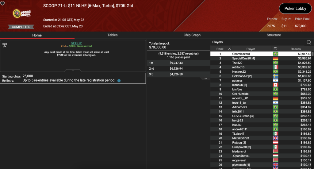 Auch im SCOOP 71-L: $11 NLHE 6-Max ($70k GTD) verpasste ein DACH-Spieler knapp den Titel. 7.075 Entries waren nicht genug, um die Garantie zu knacken. ‚Chareleszard‘ aus Brasilien erhielt die Top-Auszahlung von $9.947 während ‚SpecialOne20‘ aus Deutschland Platz 2 für $6.926 kassierte.