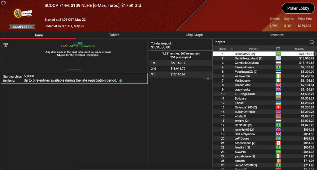 Im SCOOP 71-M: $109 NLHE 6-Max ($175k GTD) kauften sich 1.231 Spieler insgesamt 1.798 mal ein und somit gab es einen Preispool von $179.800. Hier hatten wir eine Bronze-Platzierung für ‚CambadaDeMixos‘ aus Österreich, aber der Sieger ‚DionataPZZ‚ kam aus Brasilien und ergatterte $27.150.
